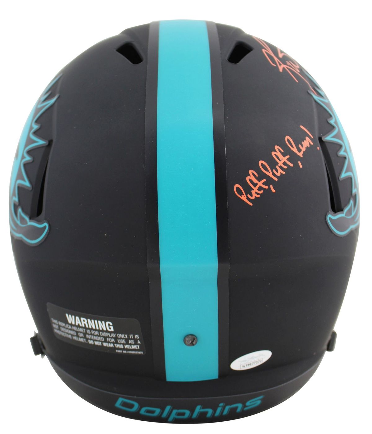 Miami Dolphins full-size replica Eclipse Alternate Speed helmet. Hand-signed and inscribed in orange paint pen by Ricky Williams.