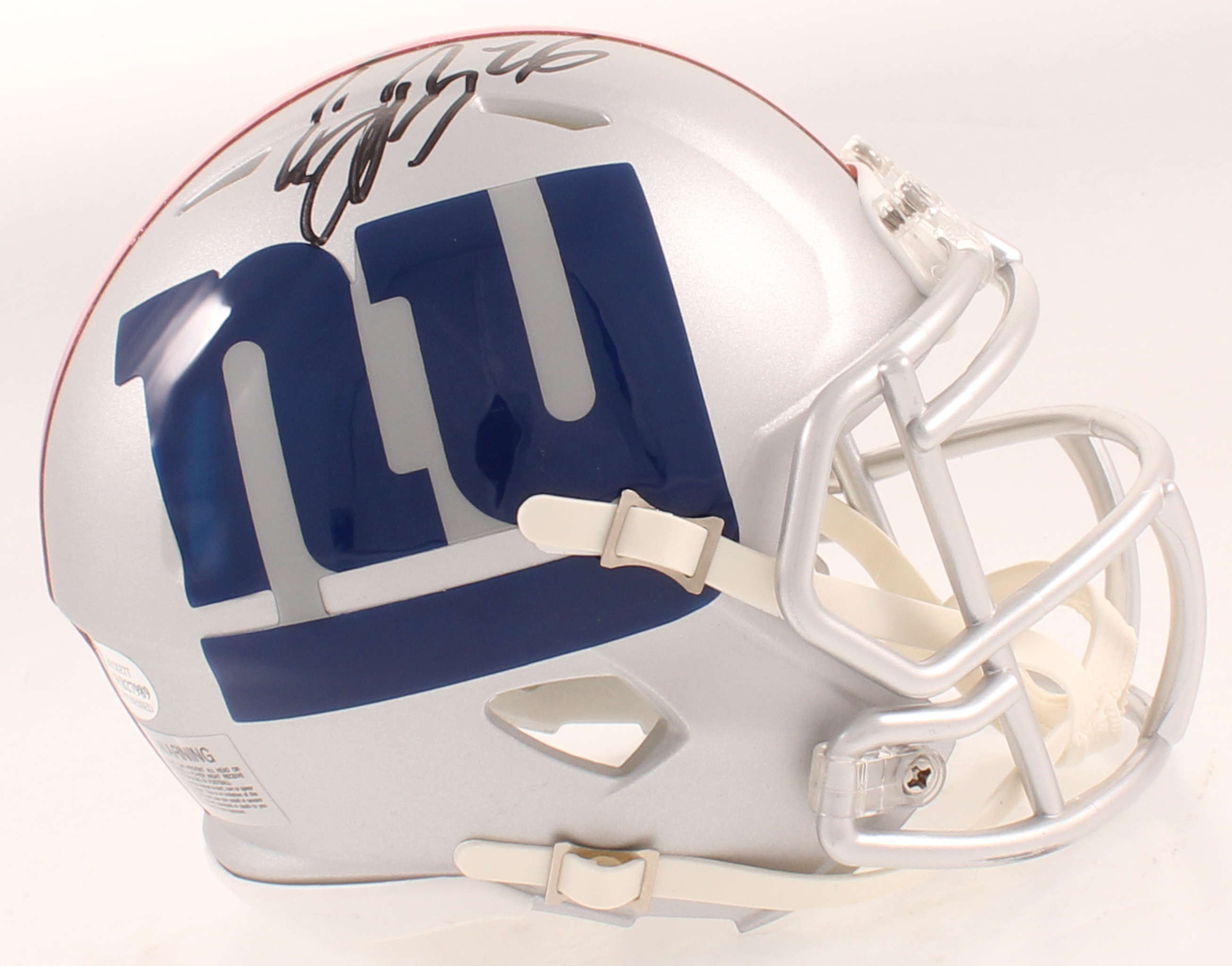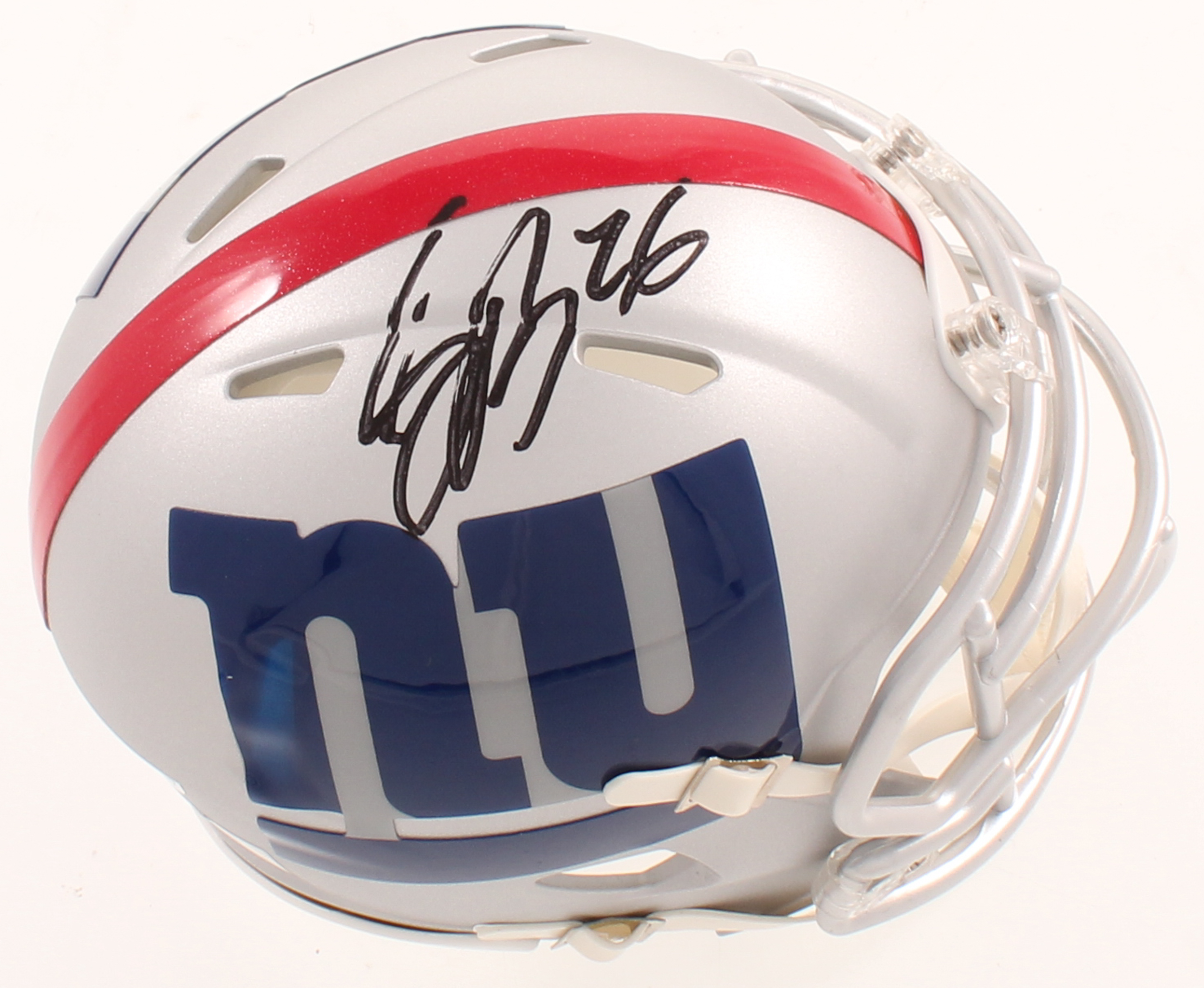 Riddell New York Giants AMP Alternate Speed mini helmet has been hand-signed in black felt-tip pen by Saquon Barkley.