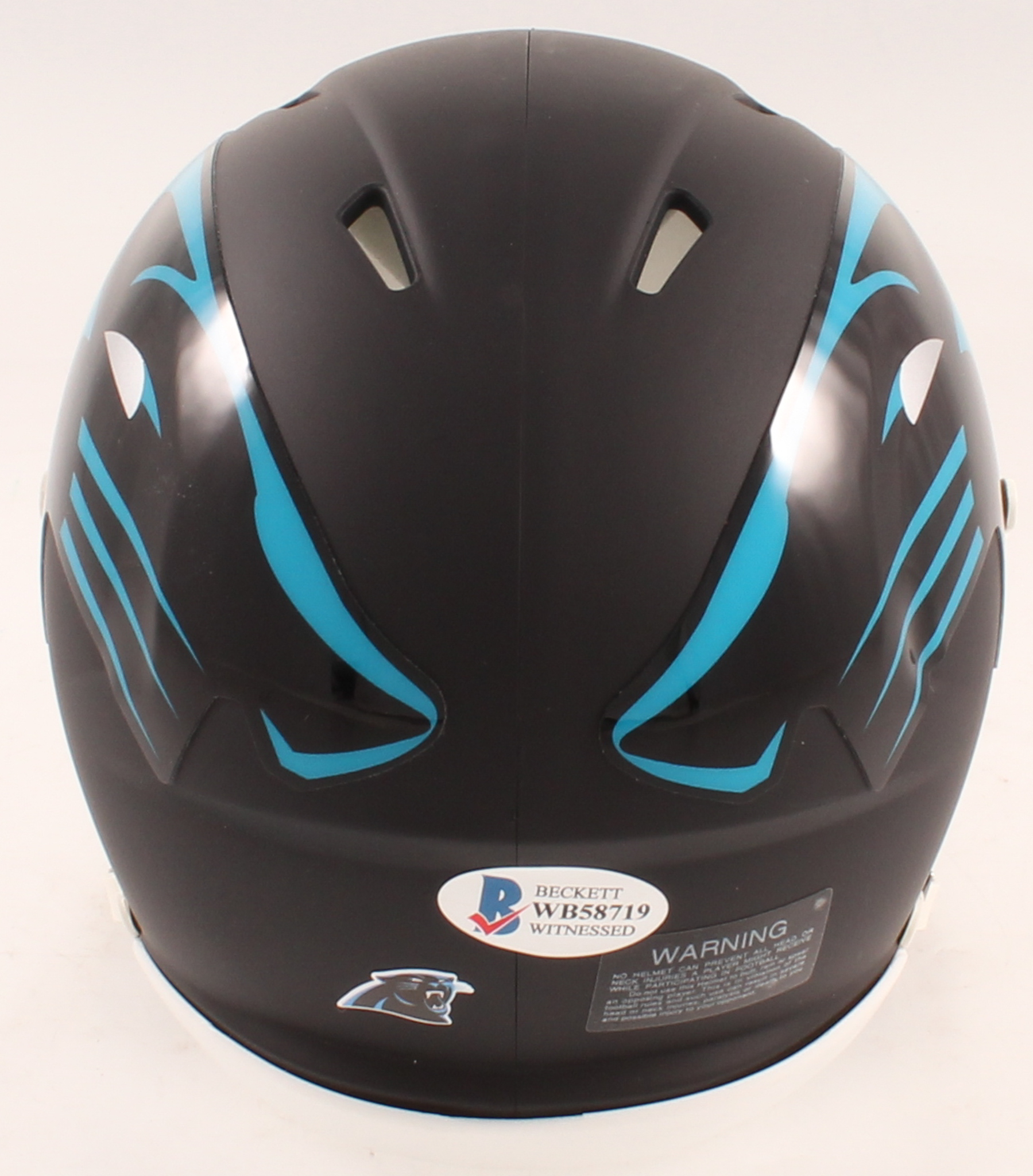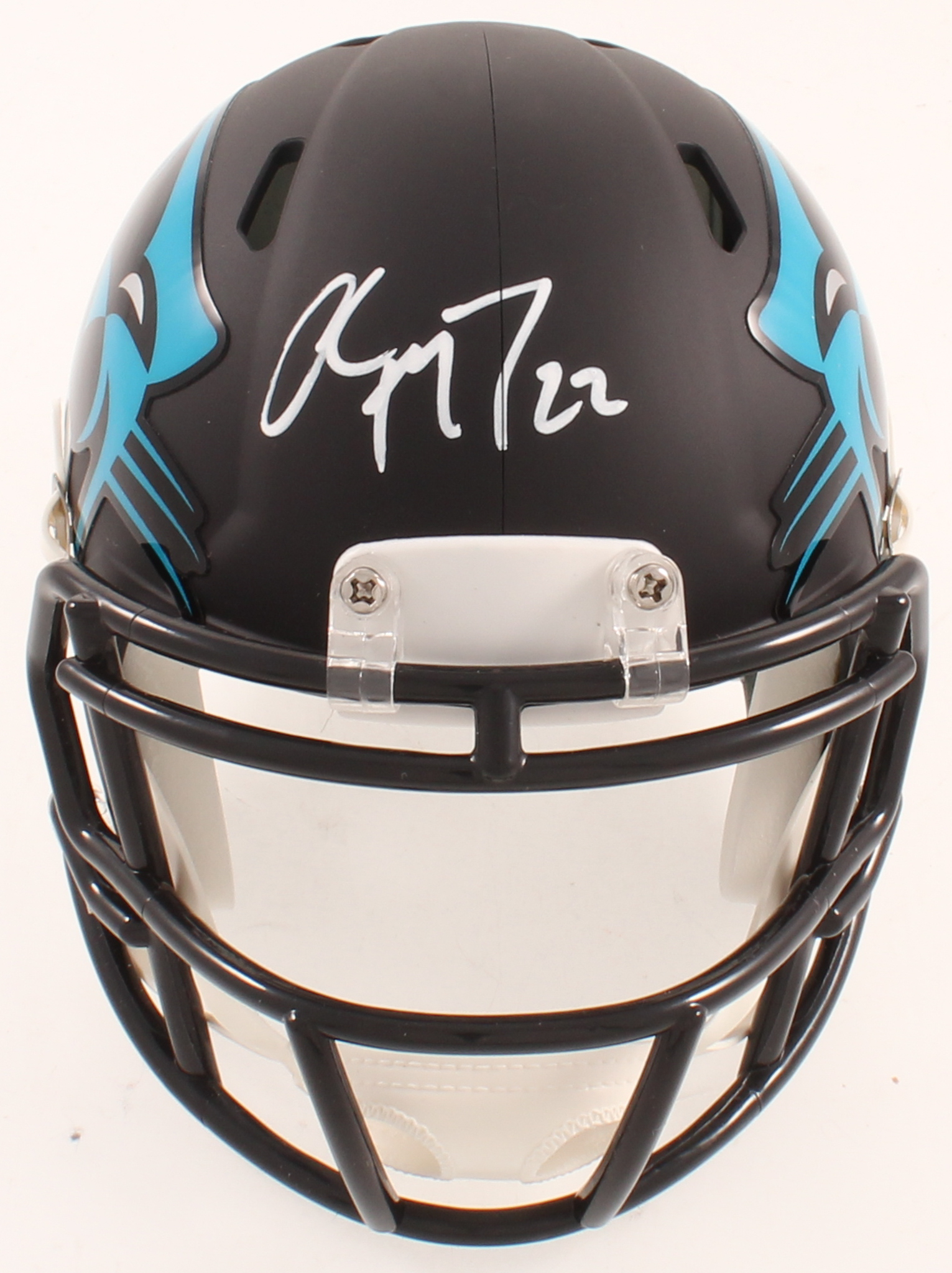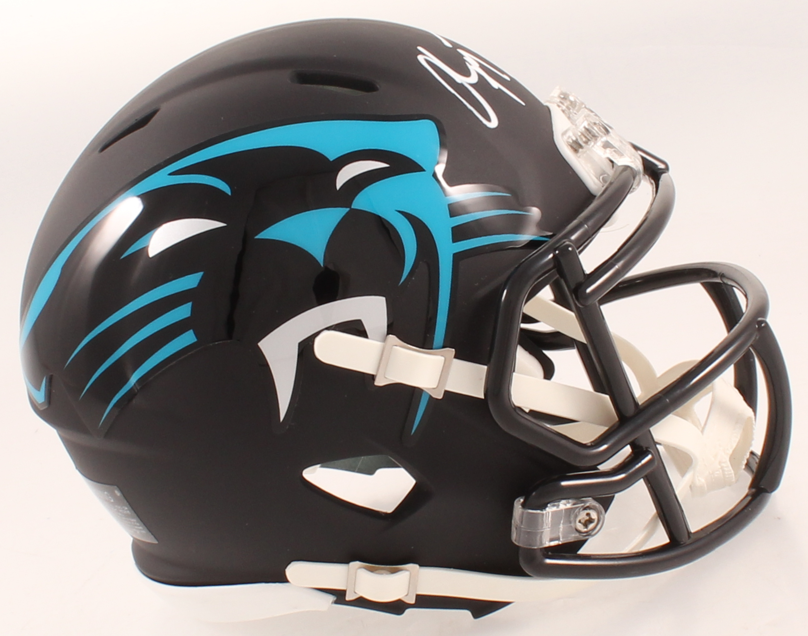 Riddell Carolina Panthers AMP alternate speed mini helmet. Hand-signed in white paint pen by Christian McCaffrey.