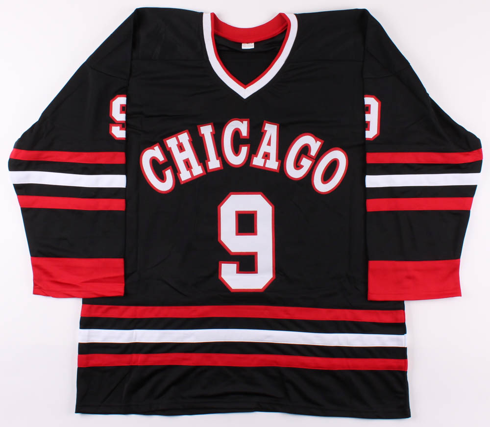 Custom on-ice style jersey with everything sewn on, size XL. Jersey has been hand-signed and inscribed in black felt-tip pen by Bobby Hull (HOF).