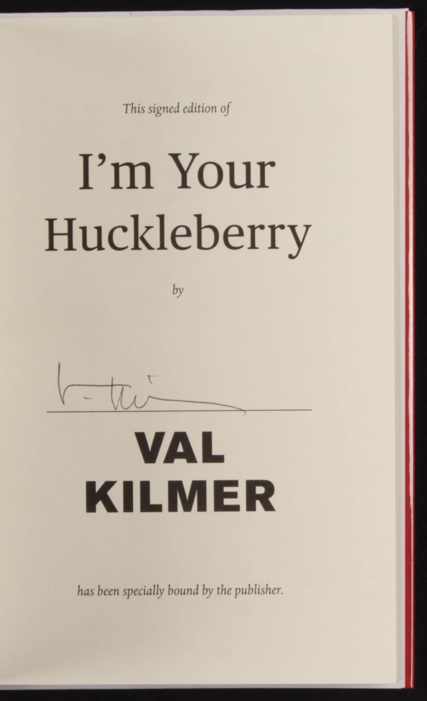 "I'm Your Huckleberry" hardcover book inside title page has been hand-signed in black ink pen by Val Kilmer. Please see images for details regarding the condition of the book.