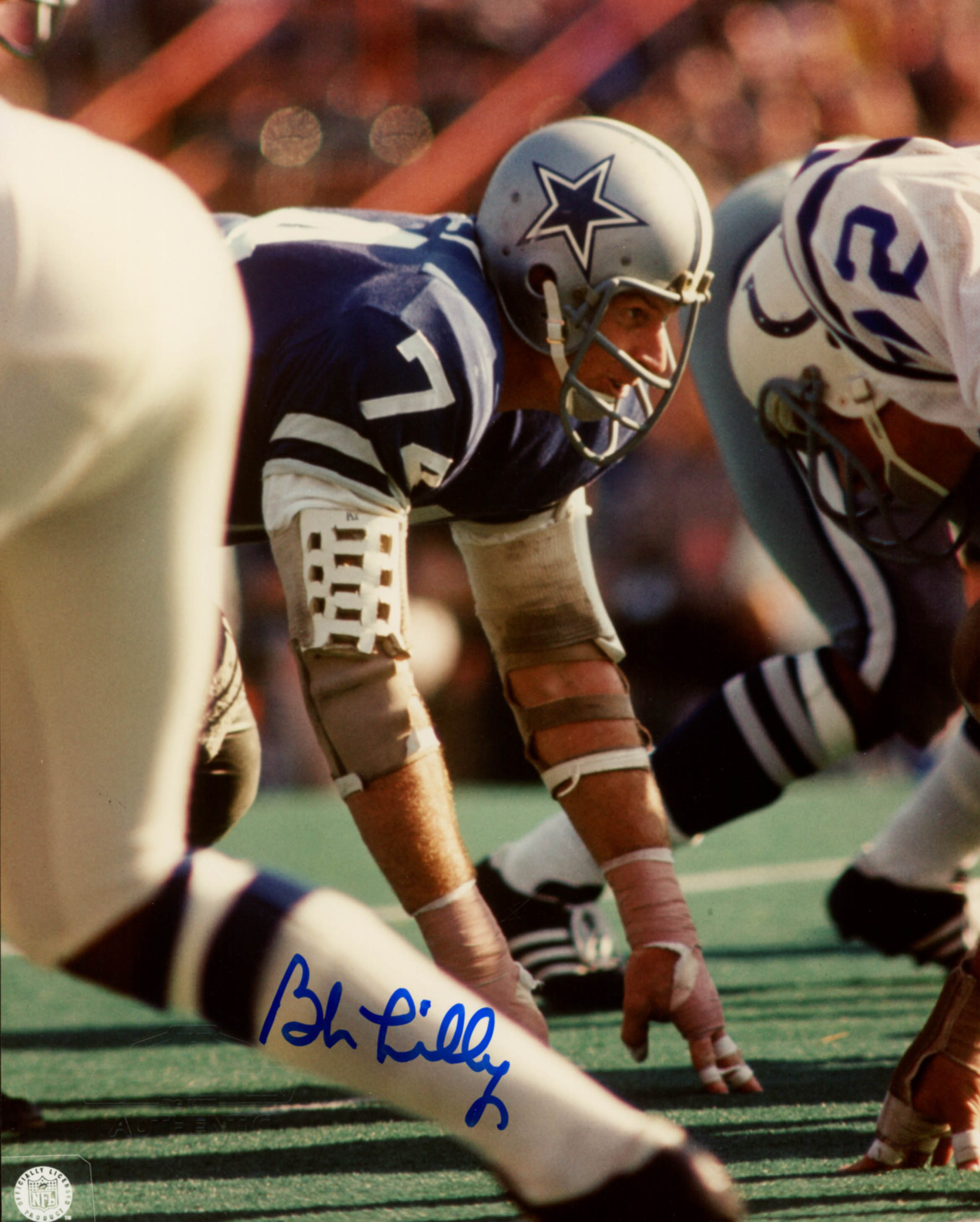 Photo measures 8" x 10" in size and has been hand-signed in blue felt-tip pen by Bob Lilly (Dallas Cowboys, HOF).