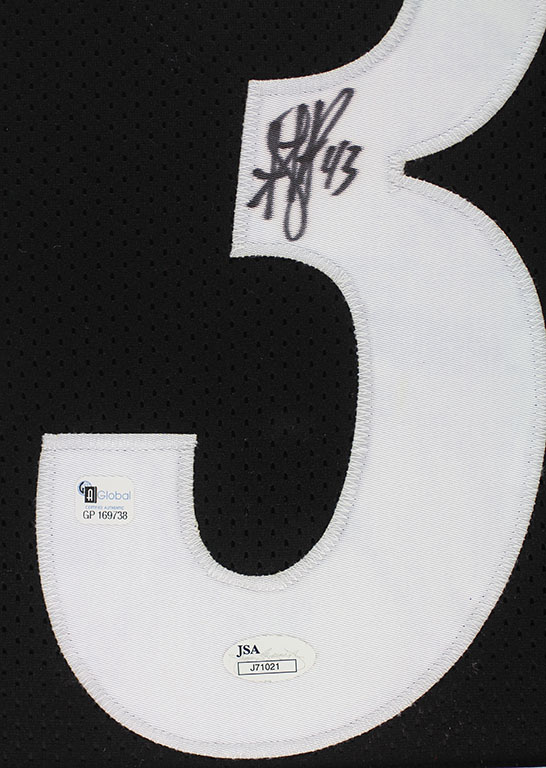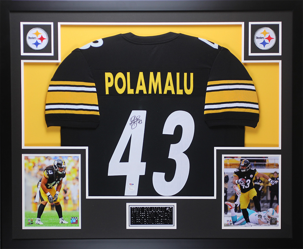 A beautifully framed autographed Troy Polamalu Steelers Jersey. The autograph was certified by JSA and includes a sticker on the Jersey and a matching certificate attached to the back of the frame.