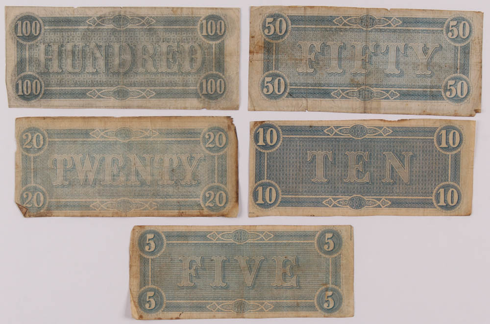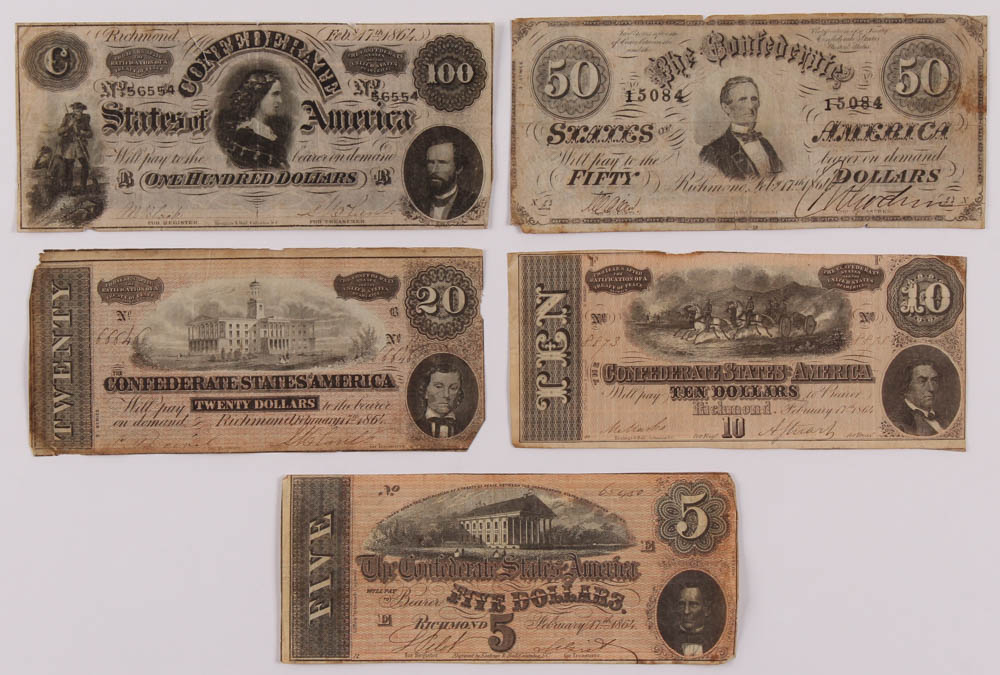 Lot of (5) 1864 Confederate Bank Notes with $100, $50, $20, $10, & $5