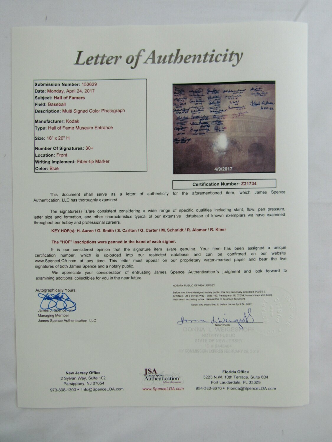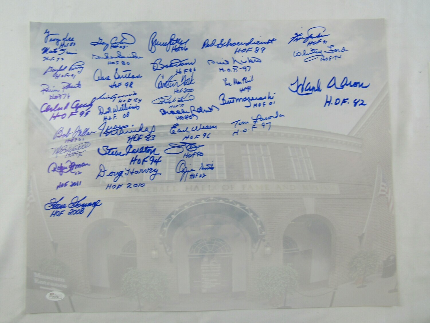 Photo measures 16" x 20" in size and has been hand-signed in blue felt-tip pen by (33) Hall of Famers with George Kell, Monte Irvin, Gaylord Perry, Robin Roberts, Orlando Cepeda, Bob Feller, Mike Schmidt, Roberto Alomar, Goose Gossage, Gary Carter, Duke Snider, Don Sutton, Luis Aparicio, Dick Williams, Juan Marichal, Steve Carlton, Doug Harvey, Bruce Sutter, Bobby Doerr, Carlton Fisk, Ralph Kiner, Brooks Robinson, Earl Weaver, Jim Palmer, Ozzie Smith, Red Schoendienst, Phil Niekro, Lee MacPhail, Bill Mazeroski, Tom Lasorda, Fergie Jenkins, Whitey Ford, Hank Aaron and (5) others.