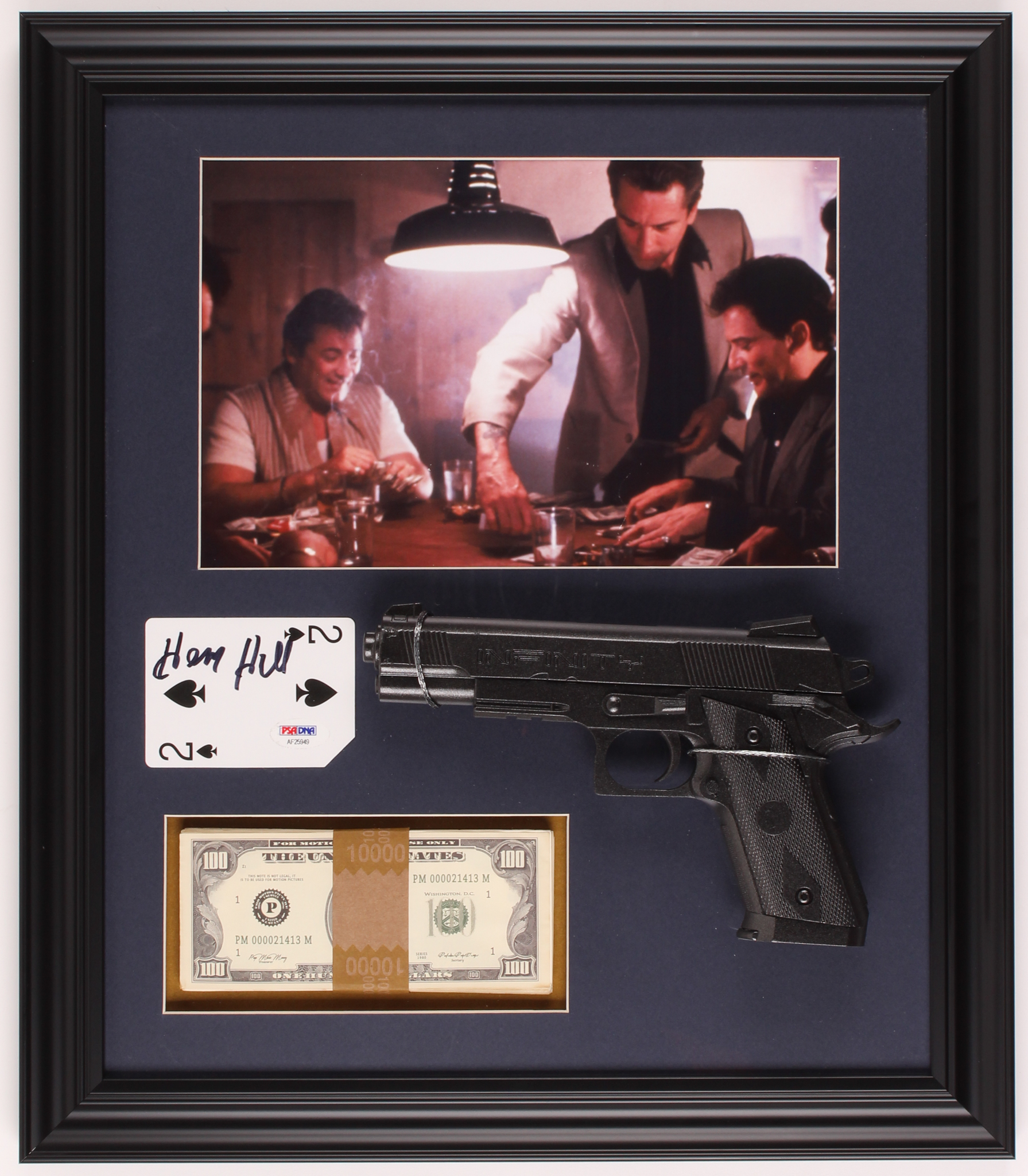 Henry Hill Signed "Goodfellas" 16.5x19 Custom Framed Playing Card Display with Stack of Prop Money & Replica Gun (PSA COA)