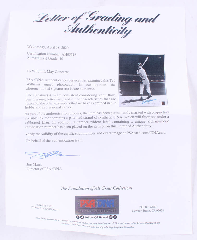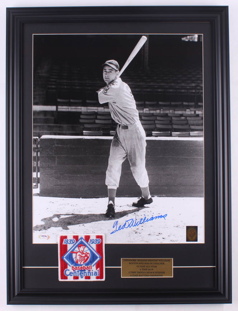 Ted Williams Signed Red Sox 19.5x26 Custom Framed Photo Display with Vintage 1939 Baseball Centennial Patch (PSA LOA)