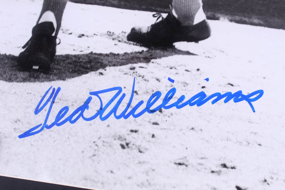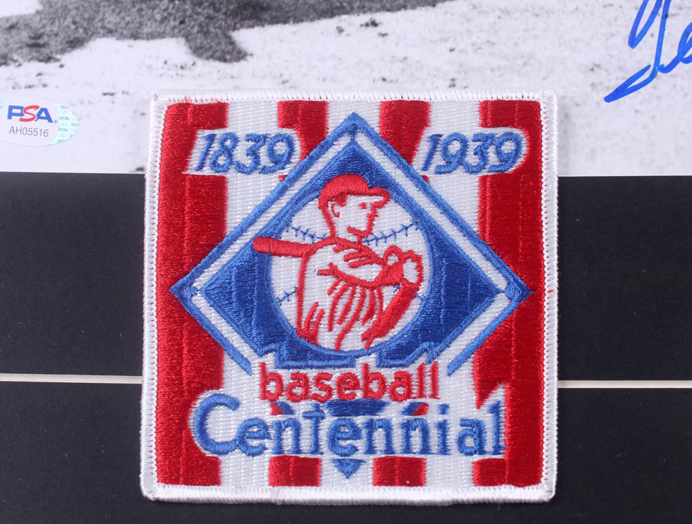 Custom frame measures 19.5" x 26" in size and features a photo that has been hand-signed in blue felt-tip pen by Ted Williams (D. 2002, HOF). Display also features a vintage 1939 Baseball Centennial Patch.