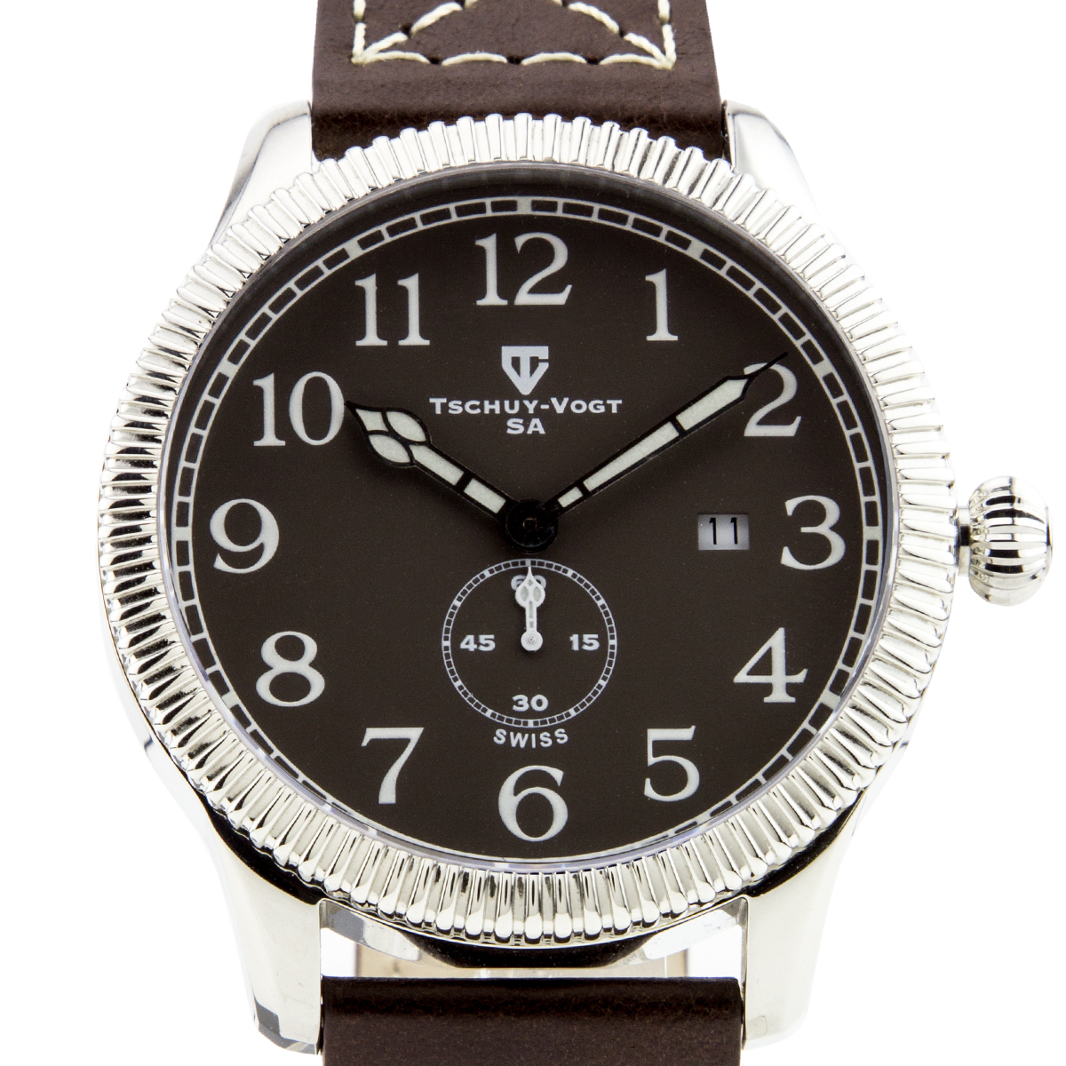 The Tschuy-Vogt A24 Cavalier Men's Watch features a brown leather strap, silver case, and gray dial. Please see photos for details.