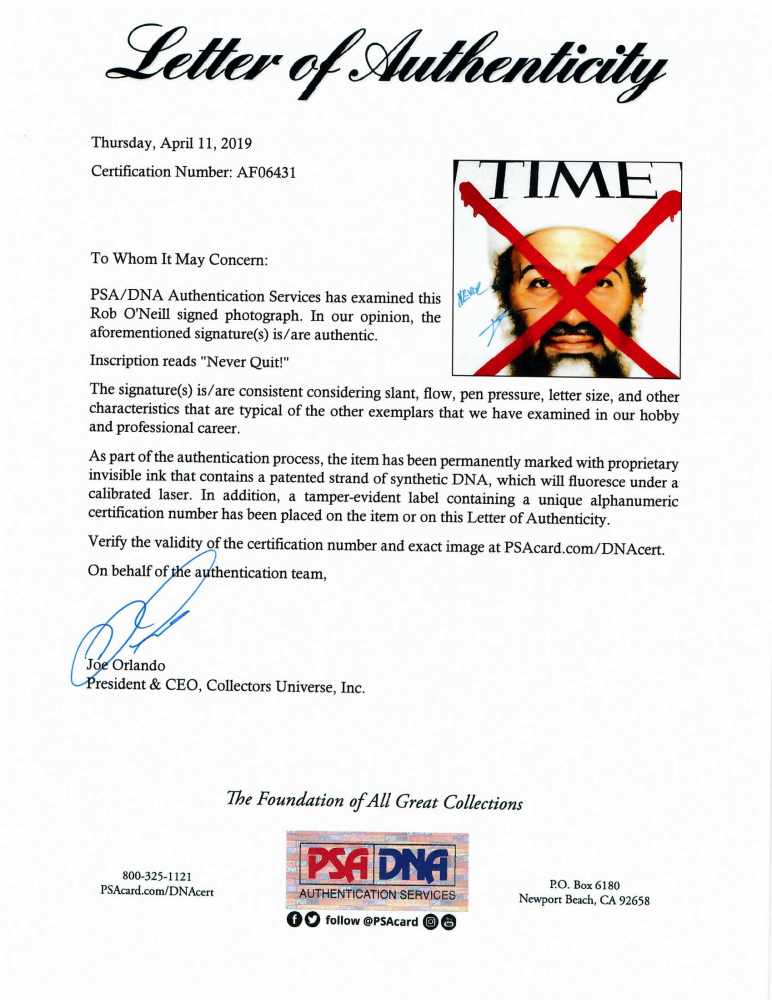 Robert O'Neill Signed 12x18 Photo Inscribed "Never Quit" (PSA LOA)