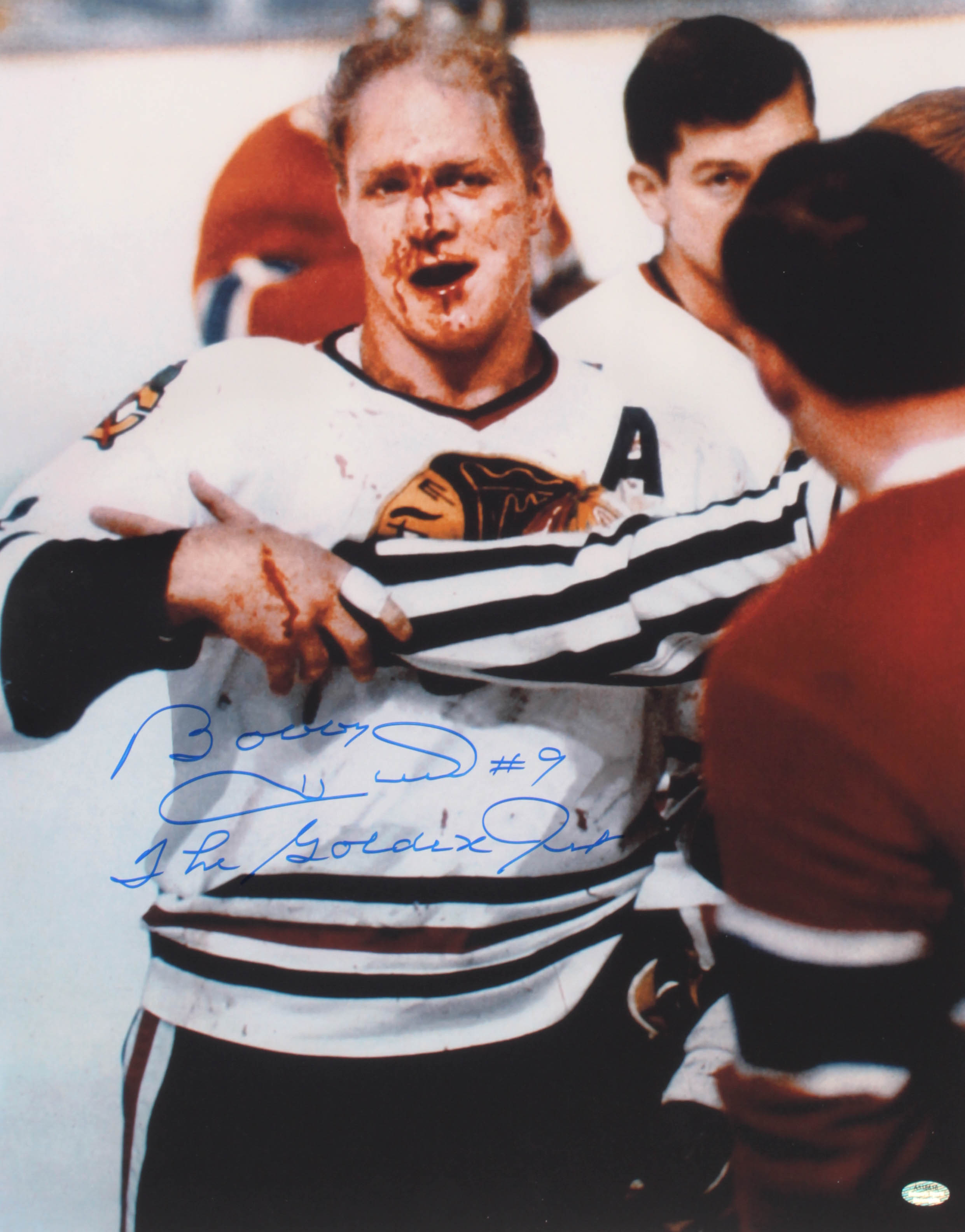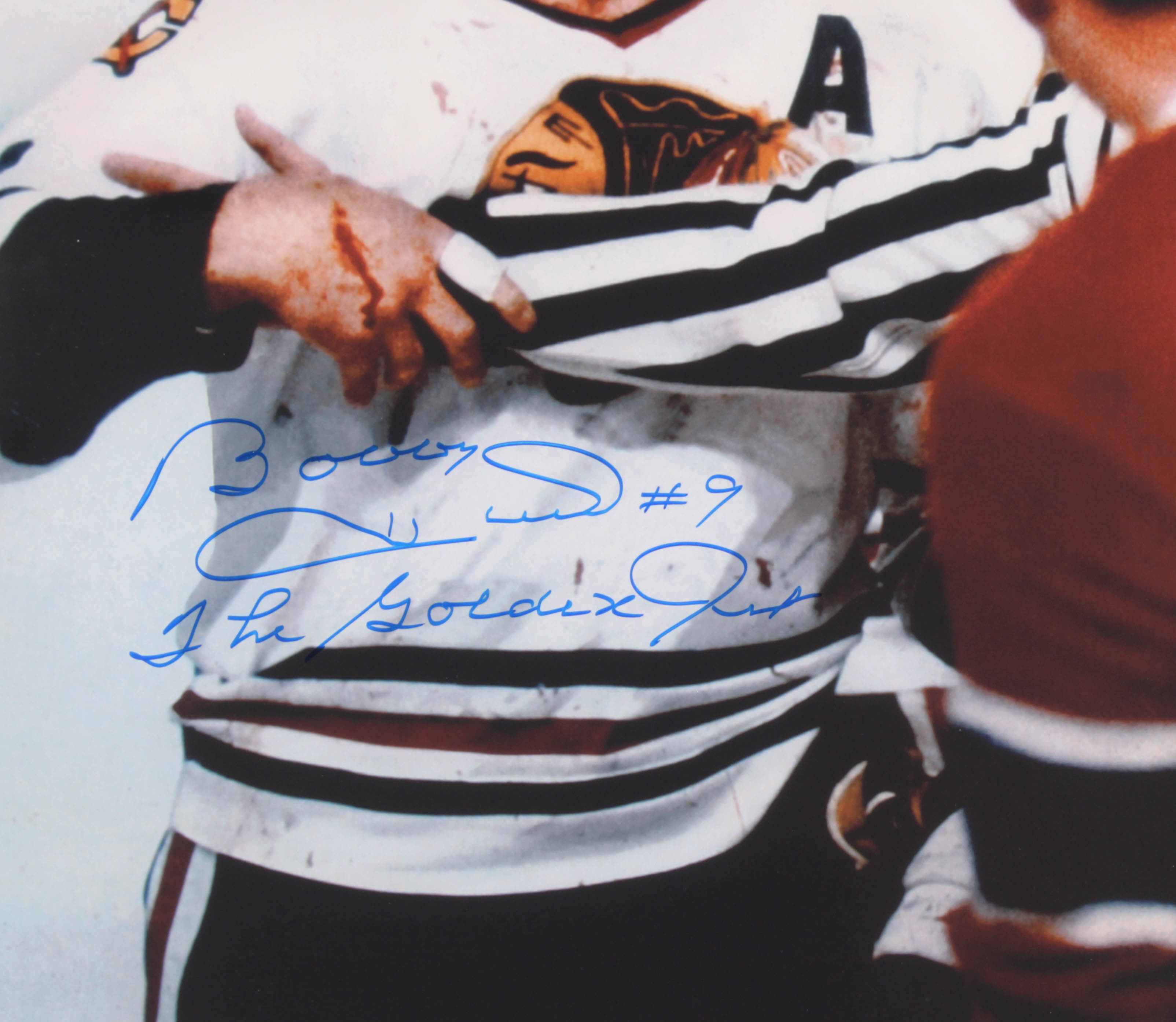 Photo measures 16 " x 20 " in size and has been hand-signed and inscribed in blue felt-tip pen by Bobby Hull (Chicago Blackhawks, HOF).