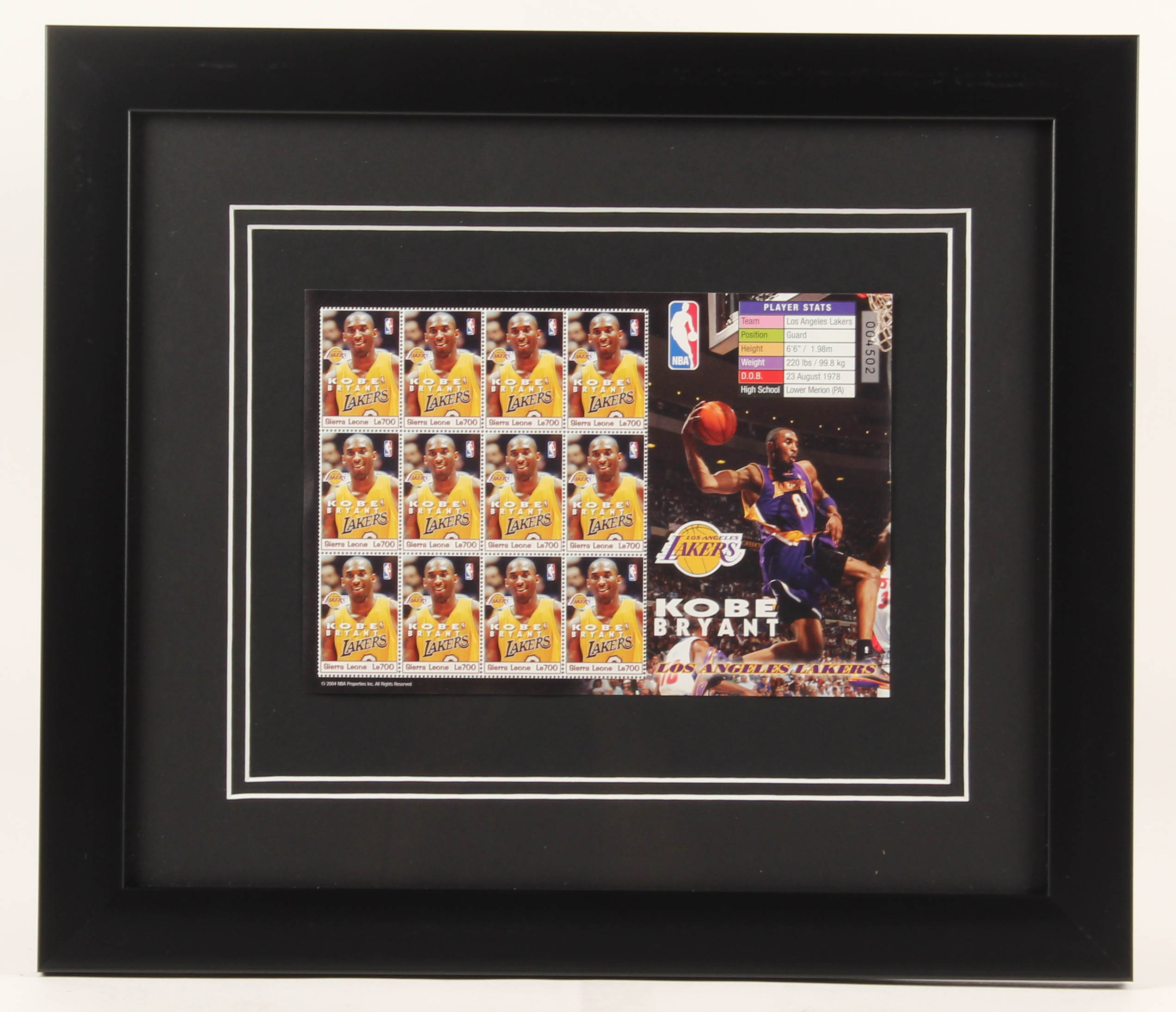 Custom frame measures 13" x 15" in size and features an uncut stamp sheet of Kobe Bryant (D. 2020, Los Angeles Lakers, HOF). Please note, display shows signs of minor handling.