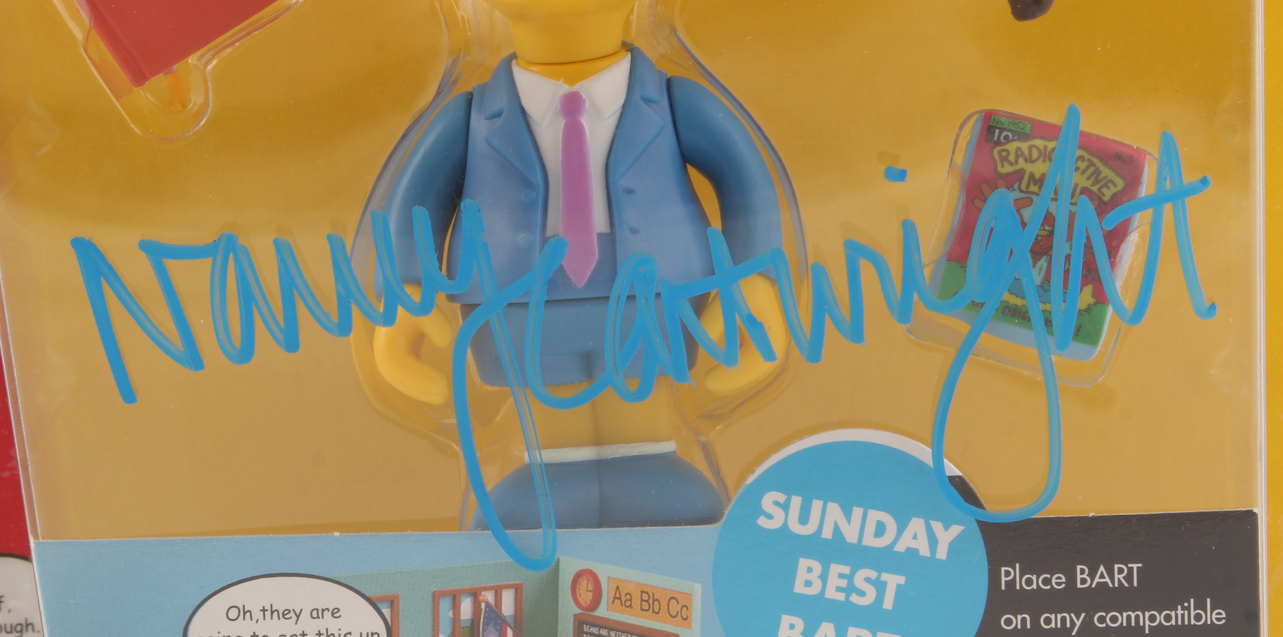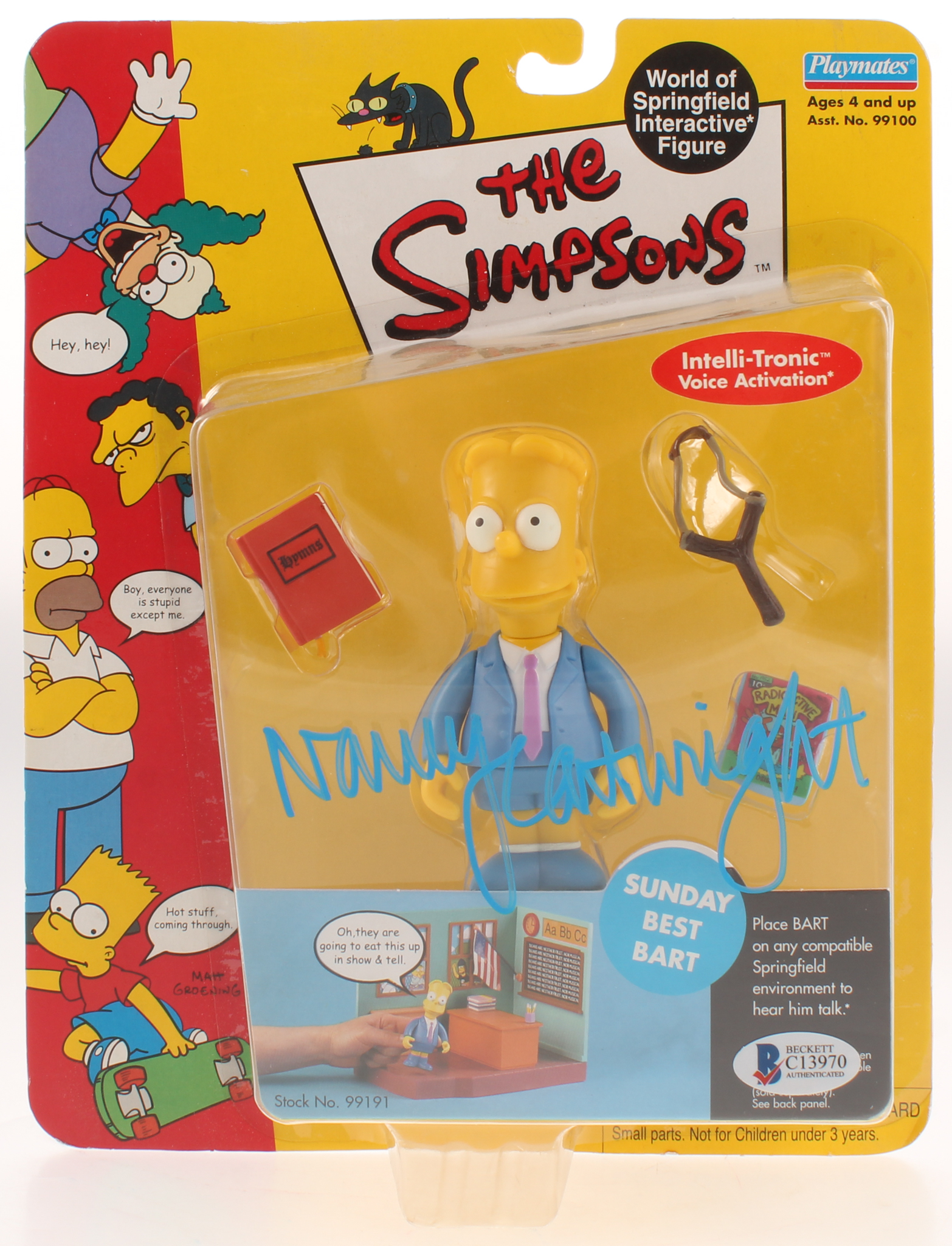 Playmates "The Simpsons" figurine measures approximately 4.5" in size and has been hand-signed in blue paint pen on the packaging by Nancy Cartwright.