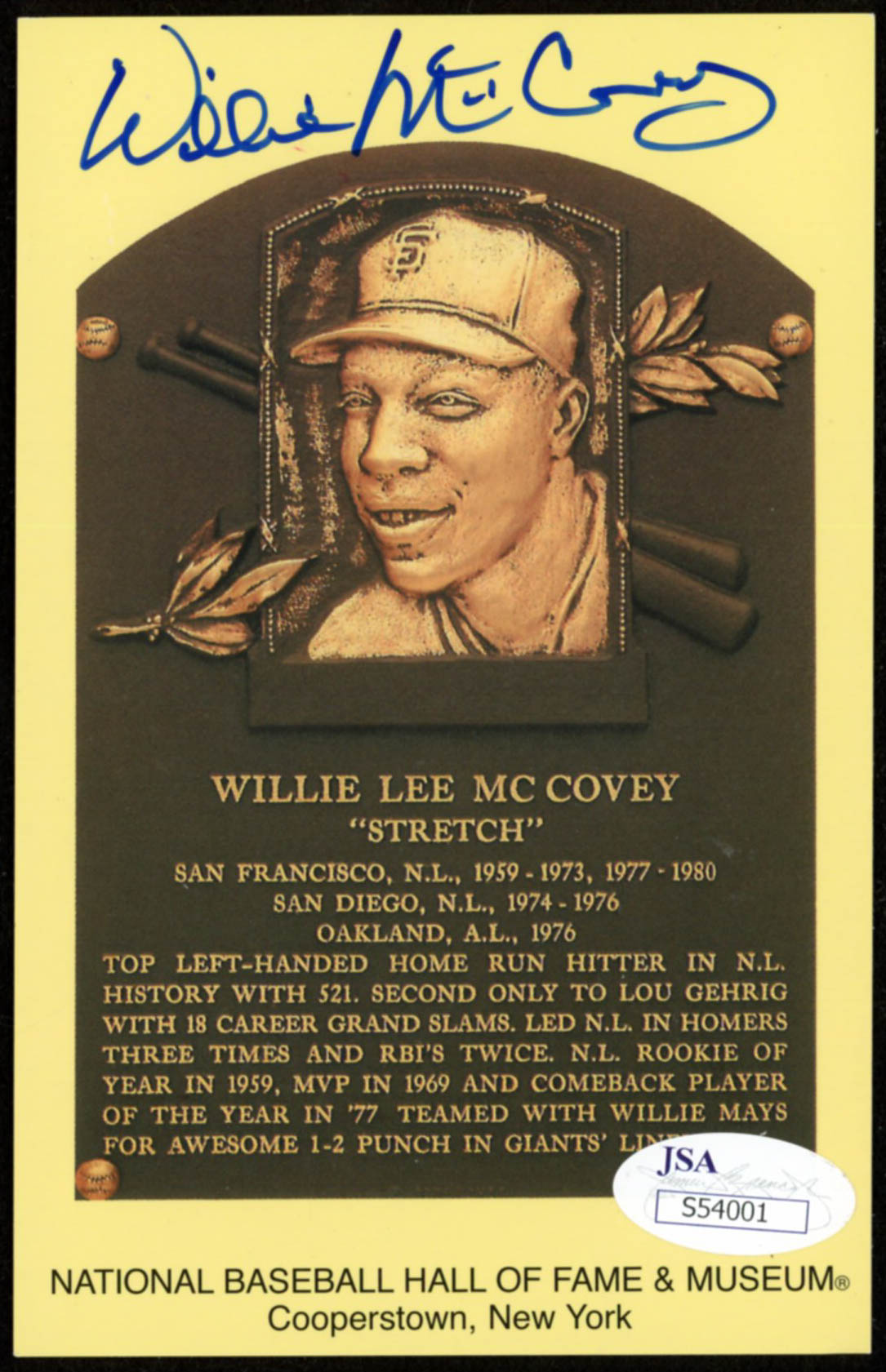 Willie McCovey Signed Gold Hall of Fame Plaque Postcard (JSA COA)