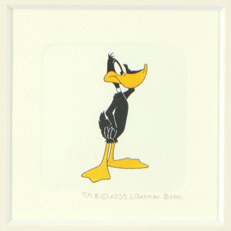 "Daffy Duck (Looking to the Side)" is a limited edition etching on paper with hand-tinted coloring from Warner Bros, numbered and dated 1999. This piece comes framed. Measures approx. 9" x 9" (with frame), 1" x 2" (image).