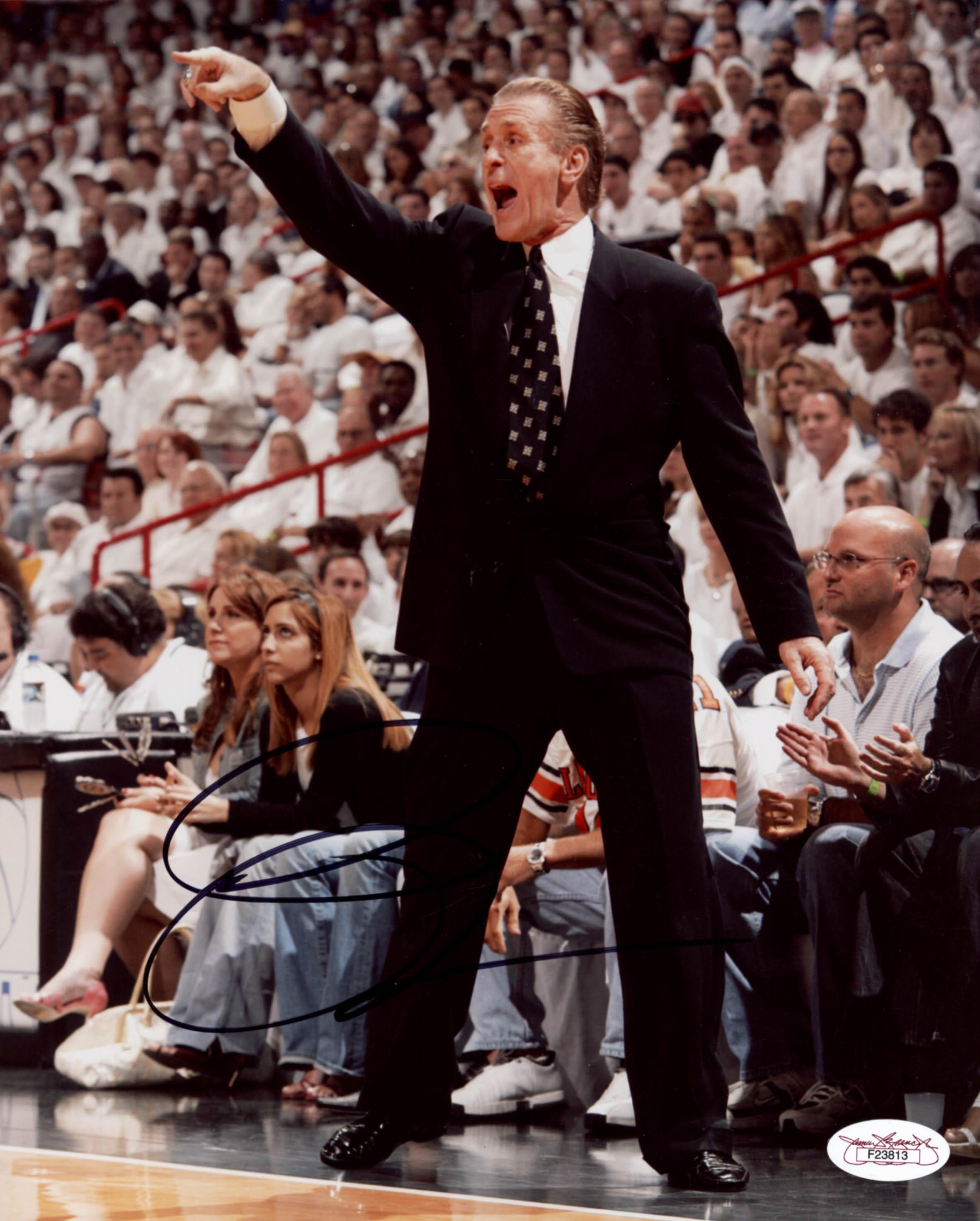 Photo measures 8" x 10" in size and has been hand-signed in black felt-tip by Pat Riley (Miami Heat, HOF).