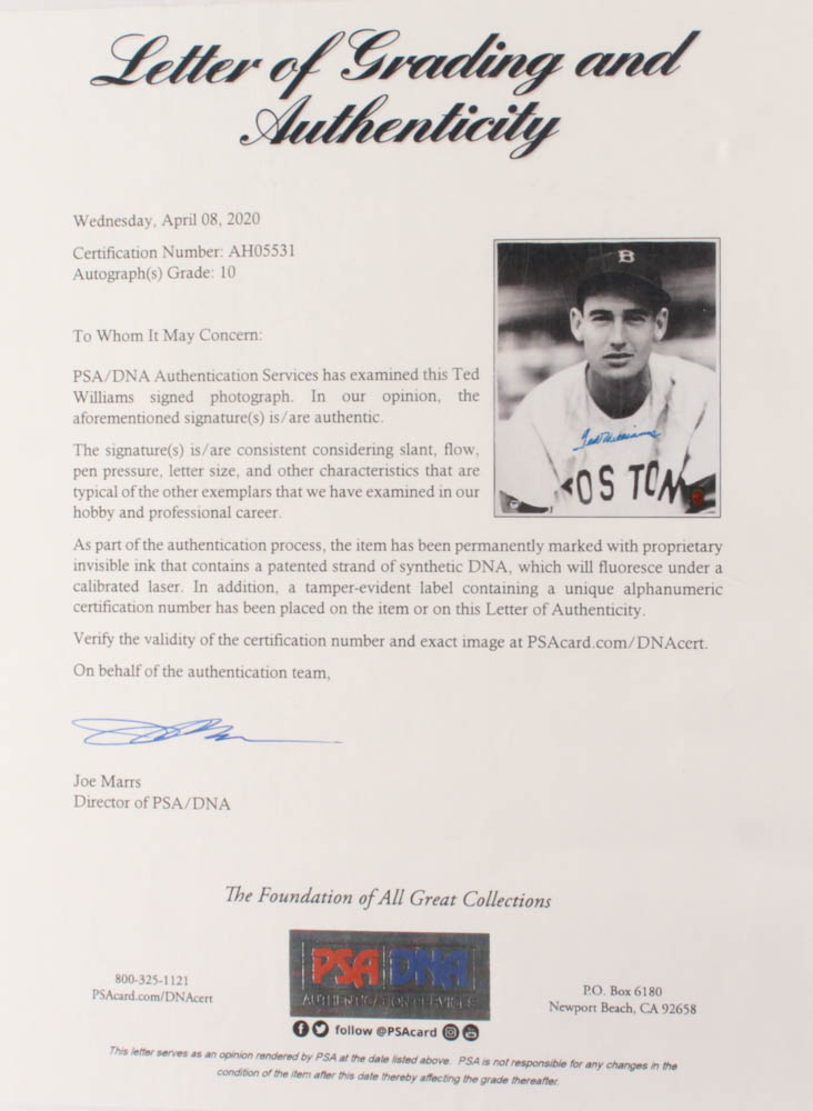 Photo measures 16" x 20" in size and has been hand signed in blue felt tip pen by Ted Williams (D. 2002, Boston Red Sox, HOF).