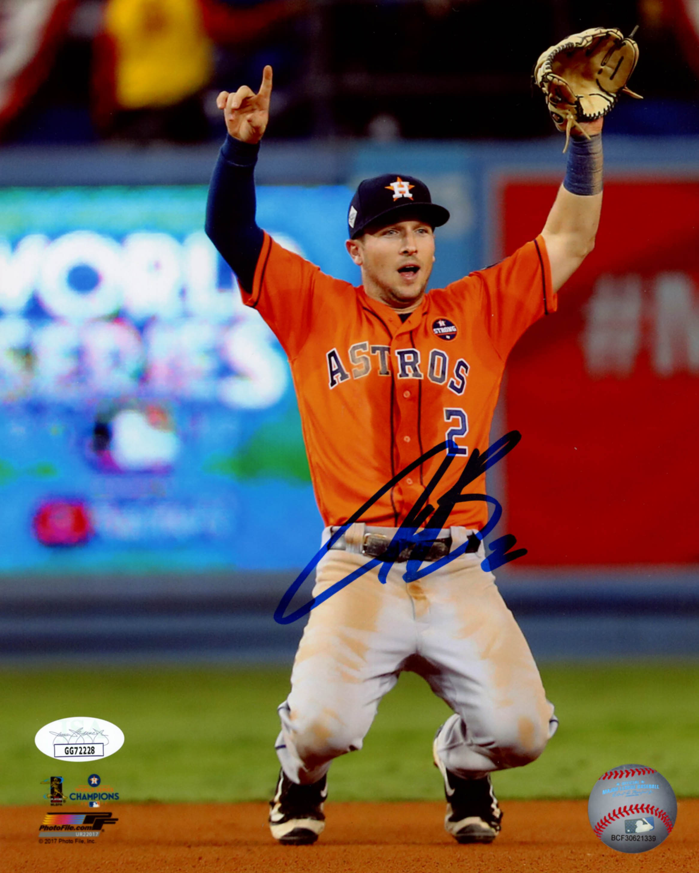 Photo measures 8" x 10" in size and has been hand-signed in blue felt-tip pen by Alex Bregman (Houston Astros).