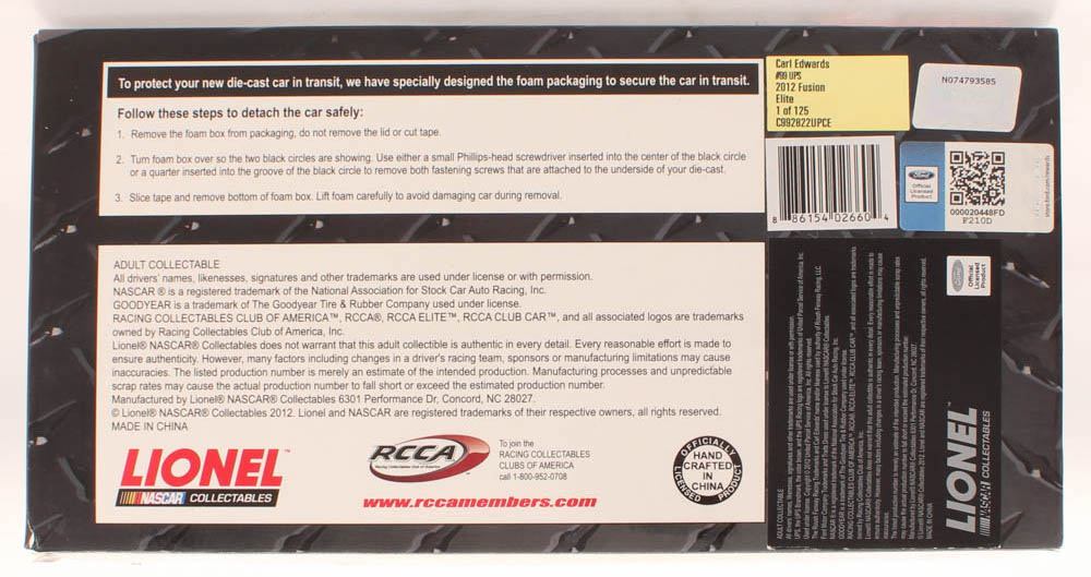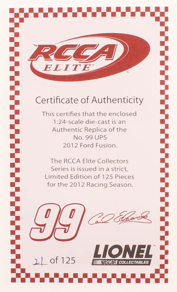 RCCA Elite Carl Edwards #99 UPS 2012 Ford Fusion diecast car. The car is limited edition and has been numbered #/125. Please note, car is unsigned.