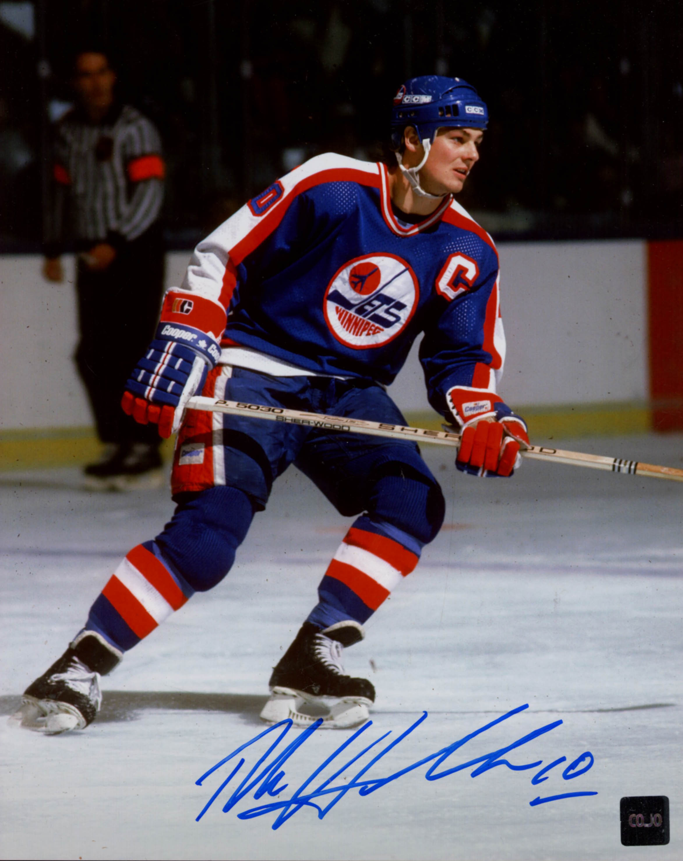 Photo measures 8" x 10" in size and has been hand-signed in blue felt-tip pen by Dale Hawerchuk (Winnipeg Jets, HOF).