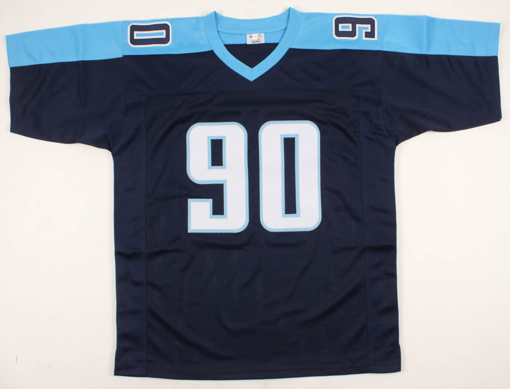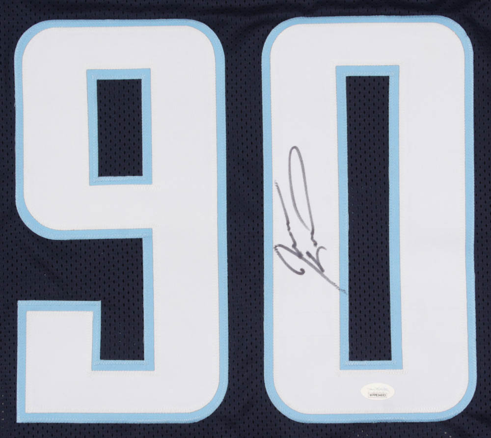Custom on-field style jersey. Everything sewn on, size XL. Hand-signed in black felt-tip pen by Jevon Kearse.
