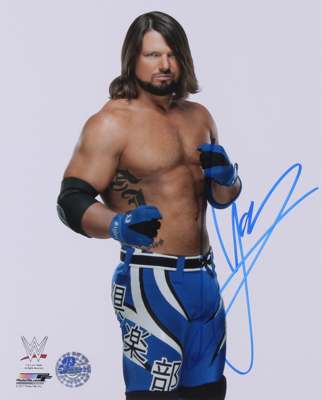 Photo measures 8" x 10" in size and has been hand-signed in blue felt-tip pen by A.J. Styles.