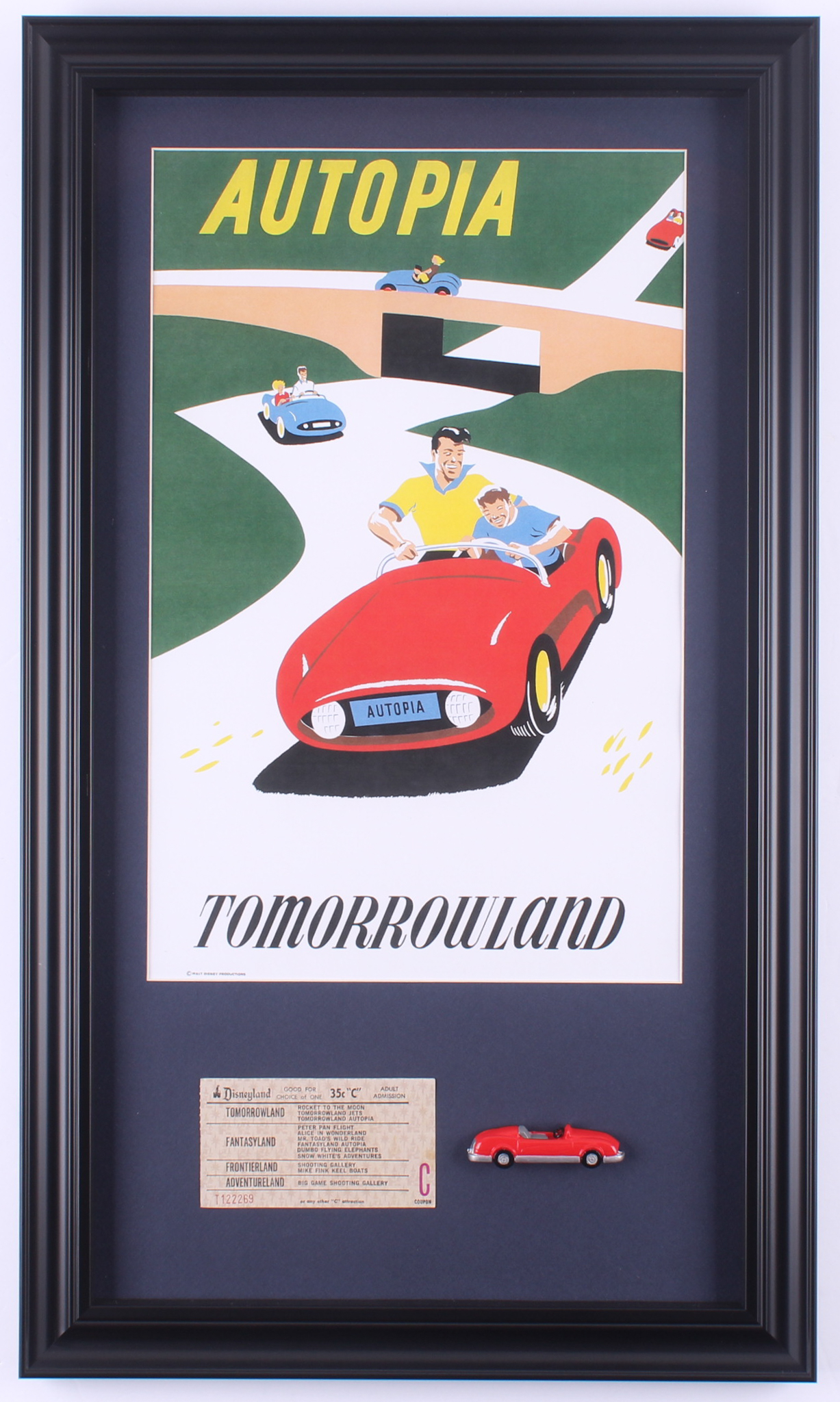 Disneyland Tomorrowland's "Autopia" 15.5x26.5 Custom Framed Print Display with Vintage 1960's Autopia Ticket & Vintage Souvenir Resin Autopia Car