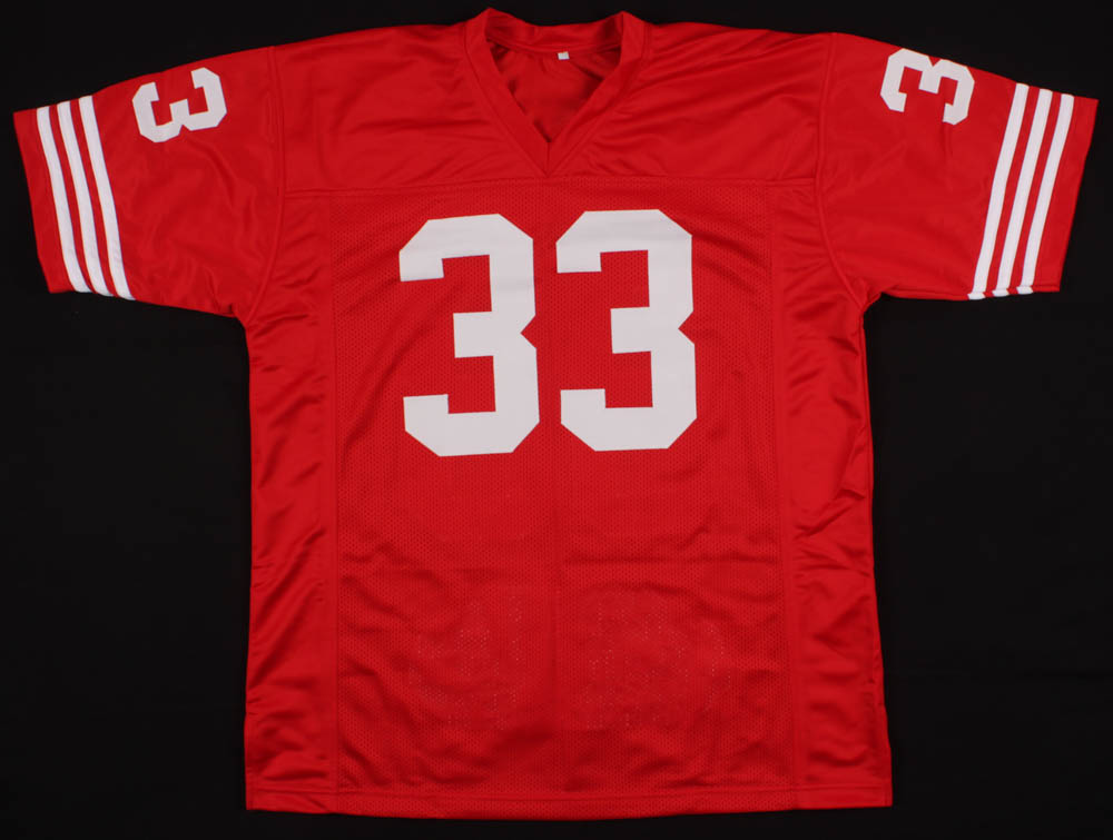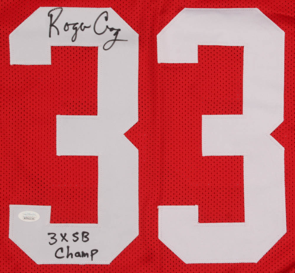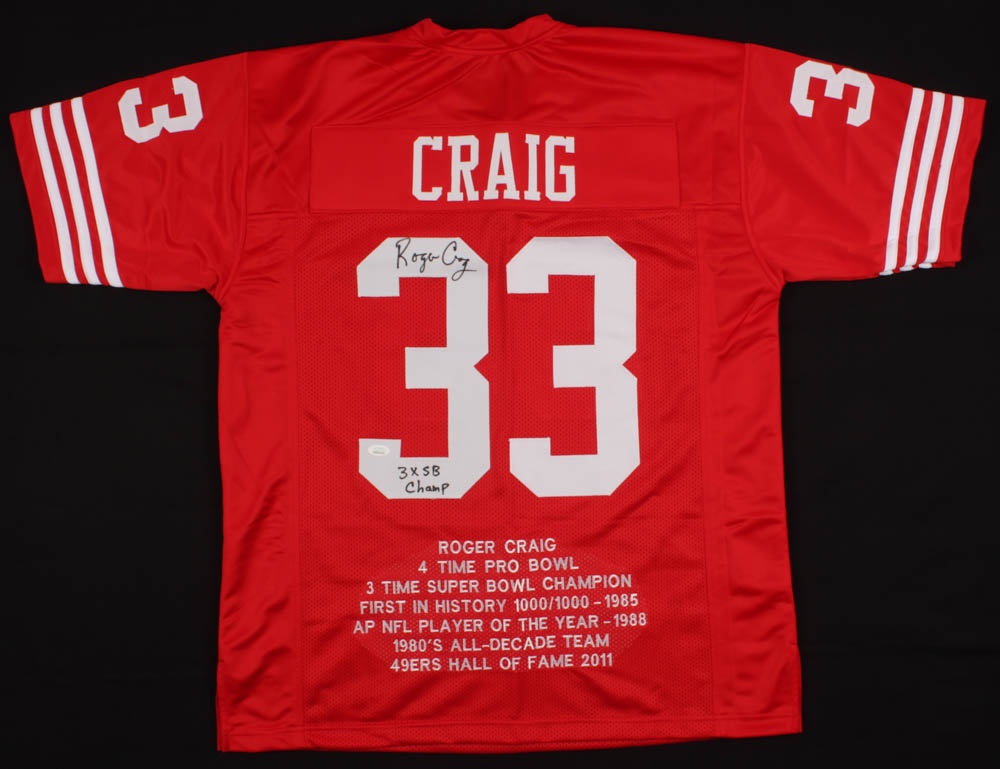 Custom on-field style jersey. Everything is sewn on, size XL. Has been hand-signed in black felt-tip pen by Roger Craig. Craig's career highlights have been custom stitched onto the back of the jersey below the reverse numbers.