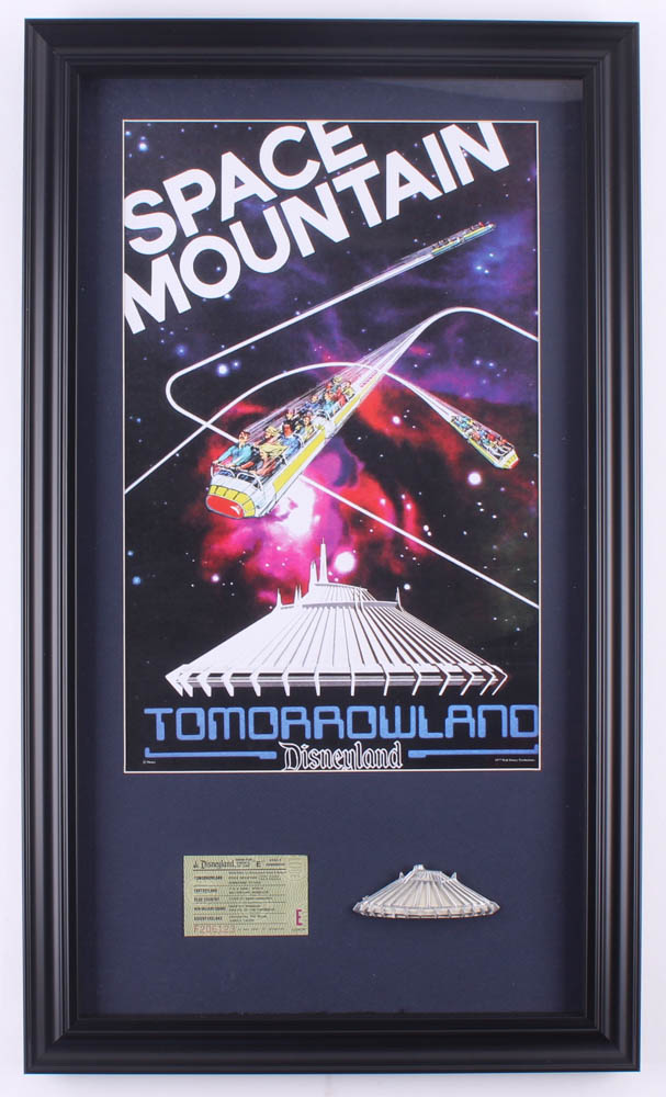 Custom frame measures 15.5" x 26.5" in size and features a vintage Disneyland print of Space Mountain. Display also features a ticket and Space Mountain magnet.