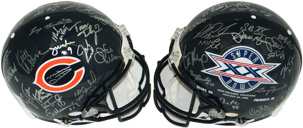 Riddell Chicago Bears Super Bowl XX full-size authentic on-field helmet. Hand-signed and inscribed by (31) including Mike Ditka, Jim McMahon, Mike Singletary, Richard Dent, Dan Hampton, Steve McMichael, Gary Fencik, William Perry, Jay Hilgenberg, Willie Gault, Wilber Marshall, Leslie Frazier, Jim Covert, Mark Bortz, Keith Van Horne, Tom Thayer, Steve Fuller, Mike Tomczak, Kevin Butler, Otis Wilson, Dennis McKinnon, Henry Waechter, Emery Moorehead, Denis Gentry, Reggie Phillips, Jim Morrissey, Maury Buford, Calvin Thomas, Thomas Sanders, Ken Taylor and Mike Hartenstine.