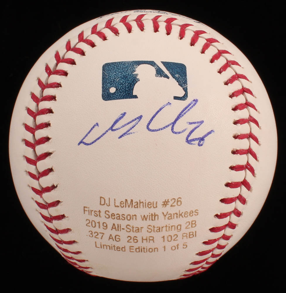 Rawlings Official Major League Baseball custom engraved baseball has been hand-signed in blue ink pen by DJ LeMahieu (New York Yankees). LeMahieu's career stat highlights are custom engraved on the baseball. Baseball is limited edition # 1 / 5.