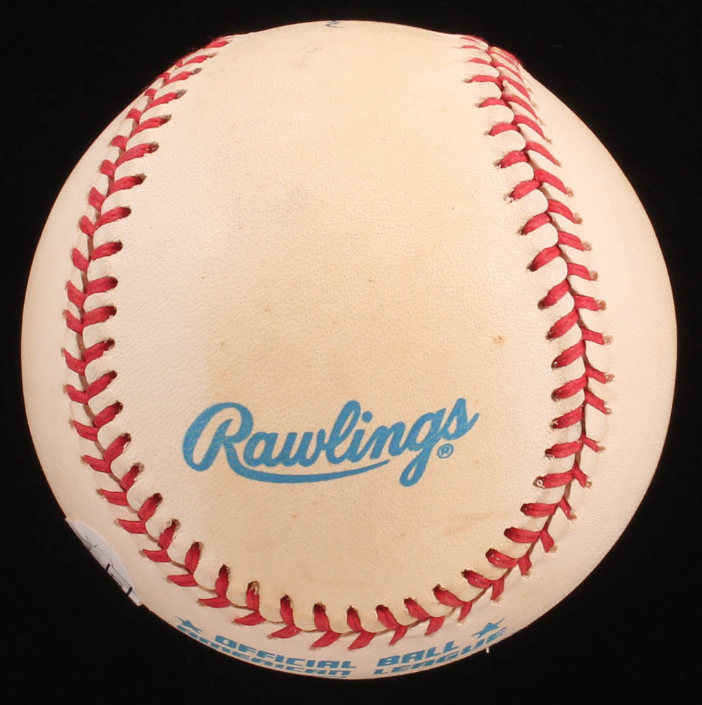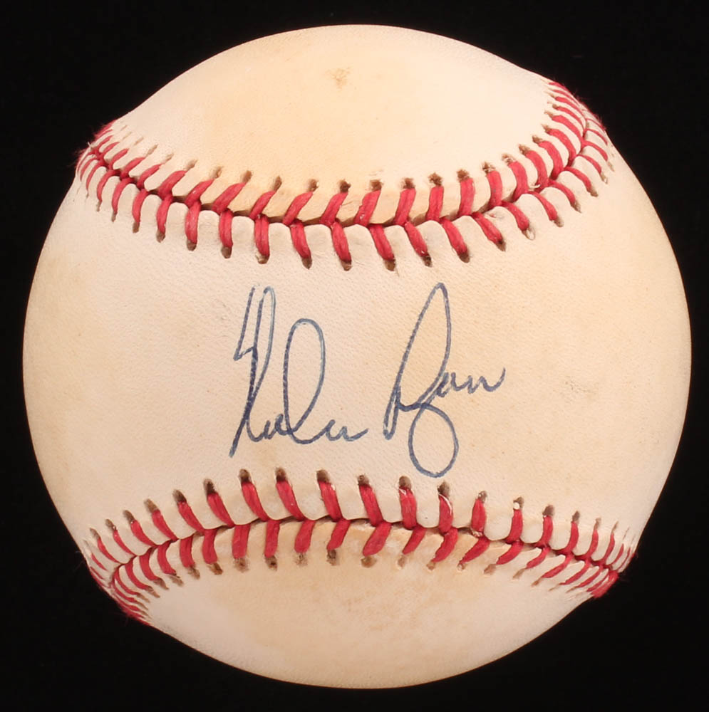 Rawlings Official American League baseball. Hand-signed in black ink pen by Nolan Ryan (Houston Astros, HOF). Please note, the baseball shows signs of natural toning.