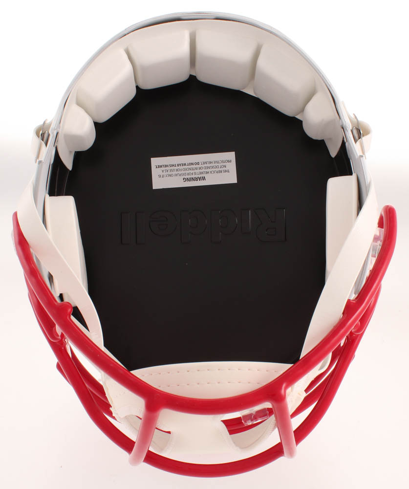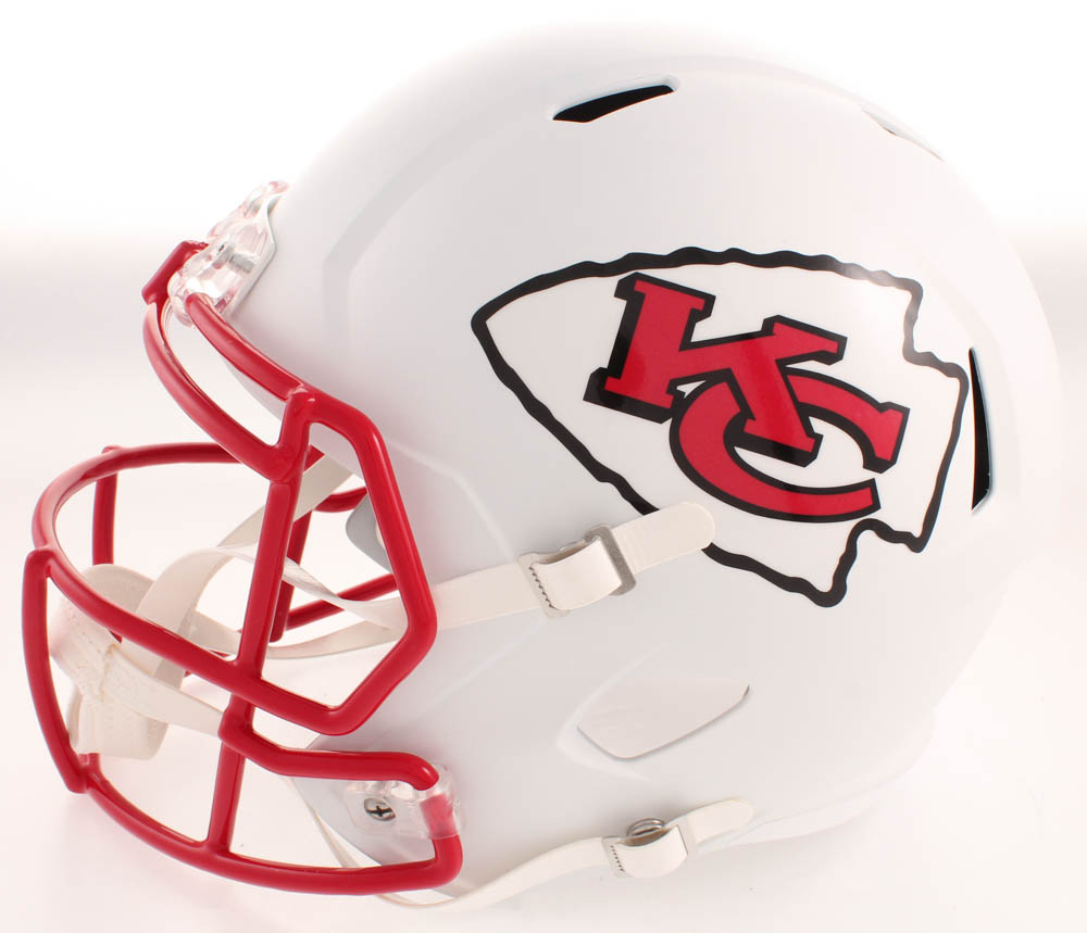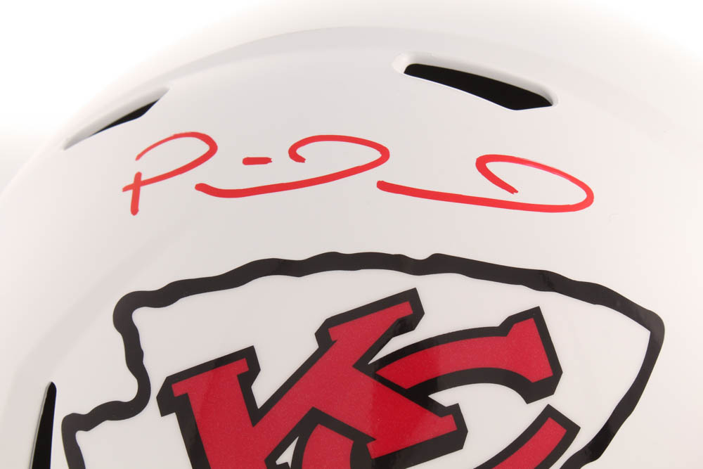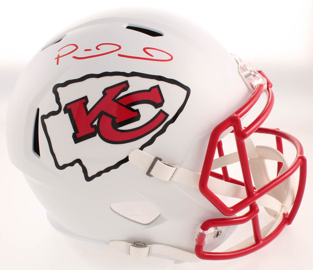 Riddell Kansas City Chiefs full-size replica matte white speed helmet. Hand-signed in red felt-tip pen by Patrick Mahomes.