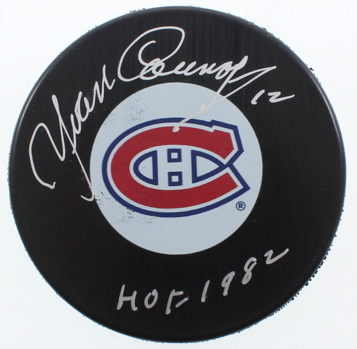 Montreal Canadiens Logo Hockey Puck. Hand-signed in silver paint pen by Yvan Cournoyer (HOF).
