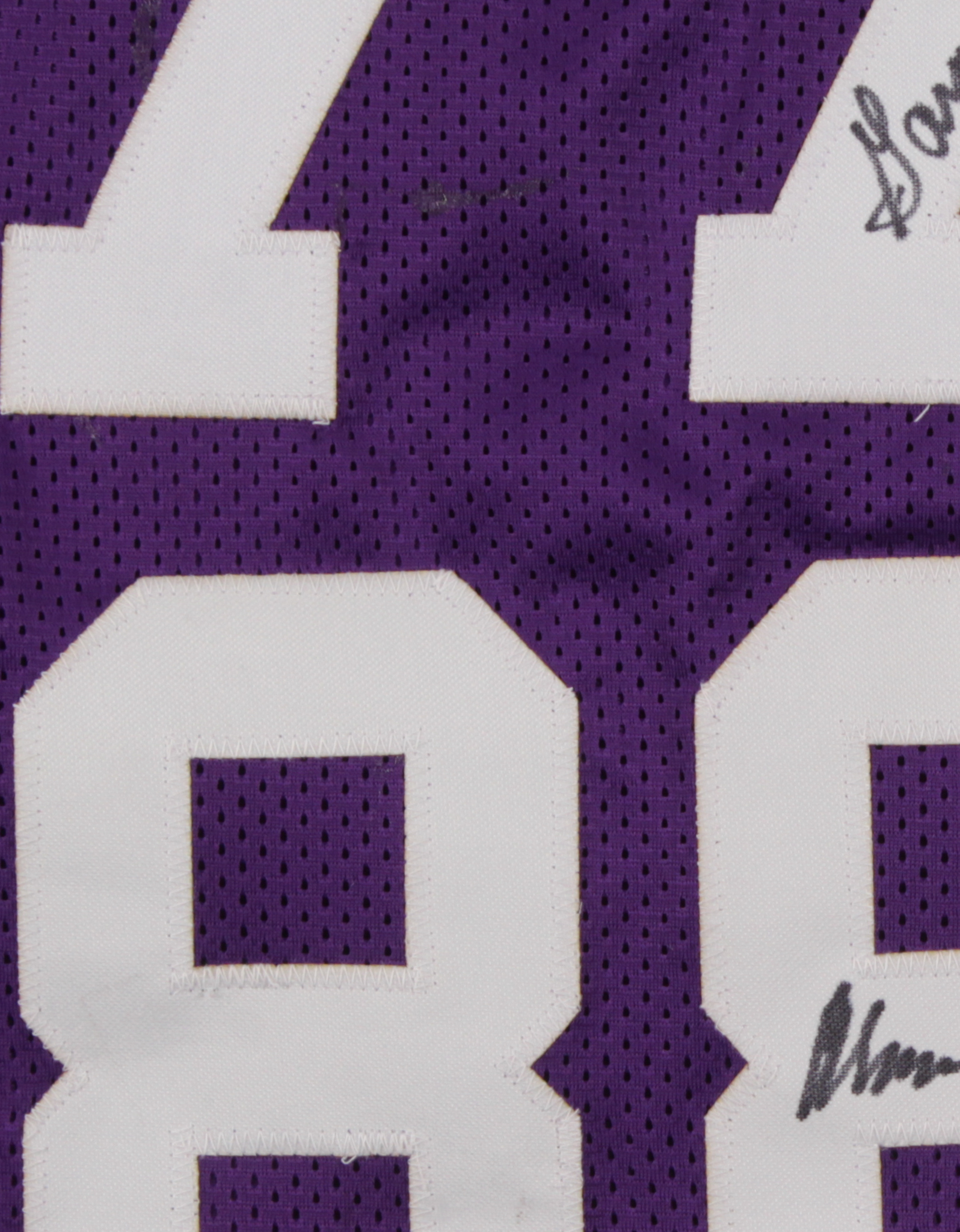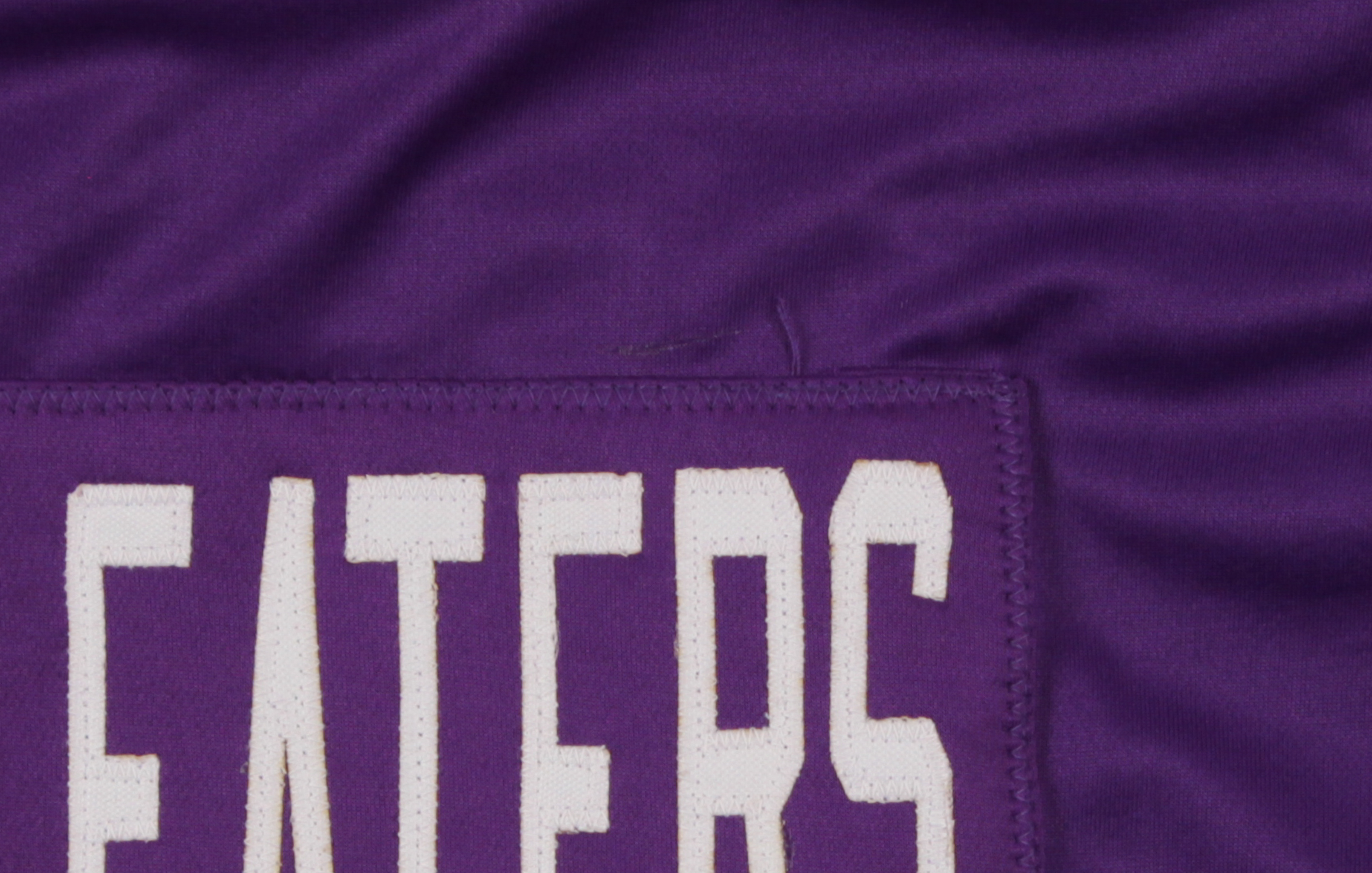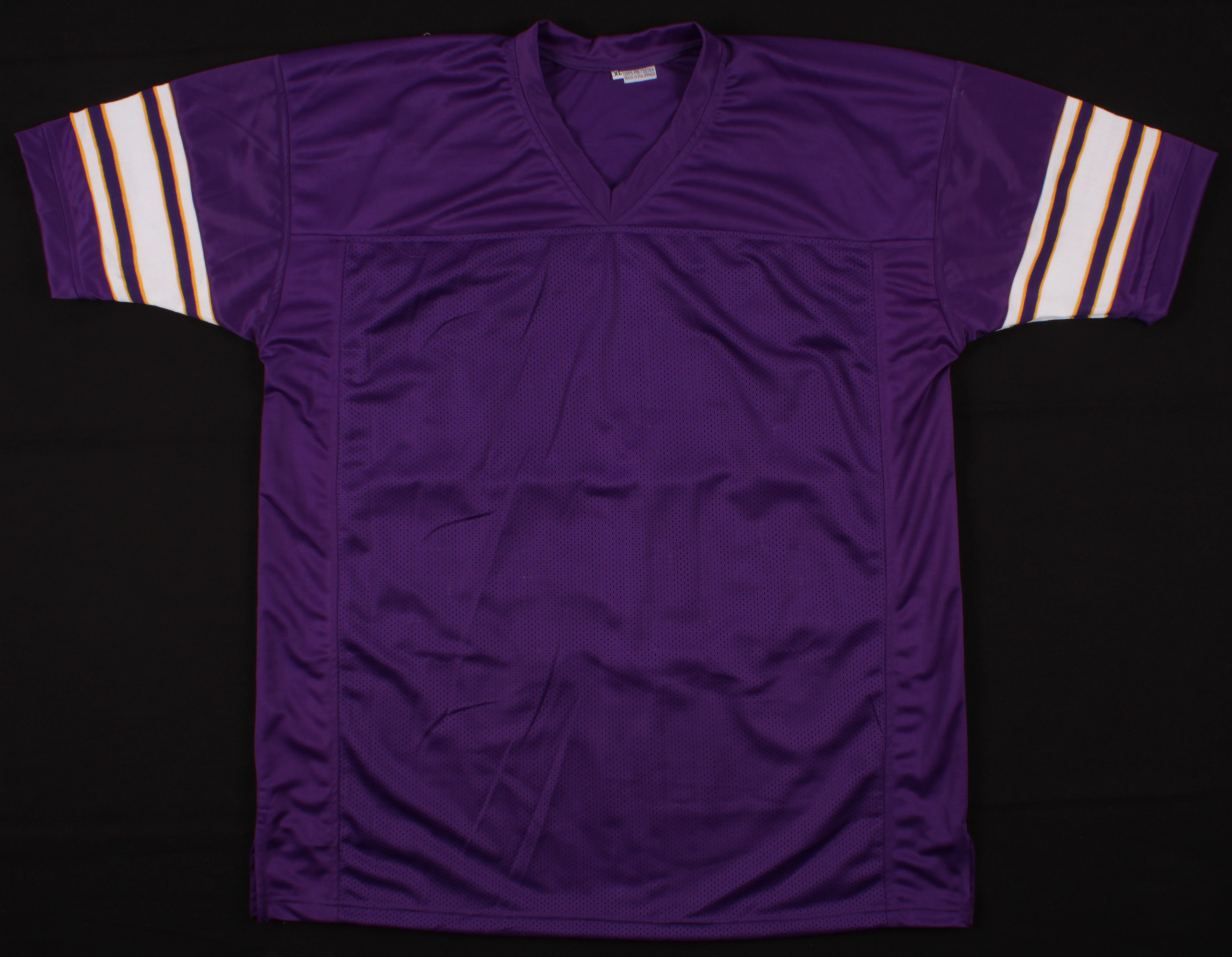 Custom on-field style jersey with everything sewn on, size XL. Jersey has been hand-signed in black felt-tip pen by (4) Purple People Eaters with Alan Page (HOF), Gary Larsen, Carl Eller (HOF), and Jim Marshall. Please see photos for details.