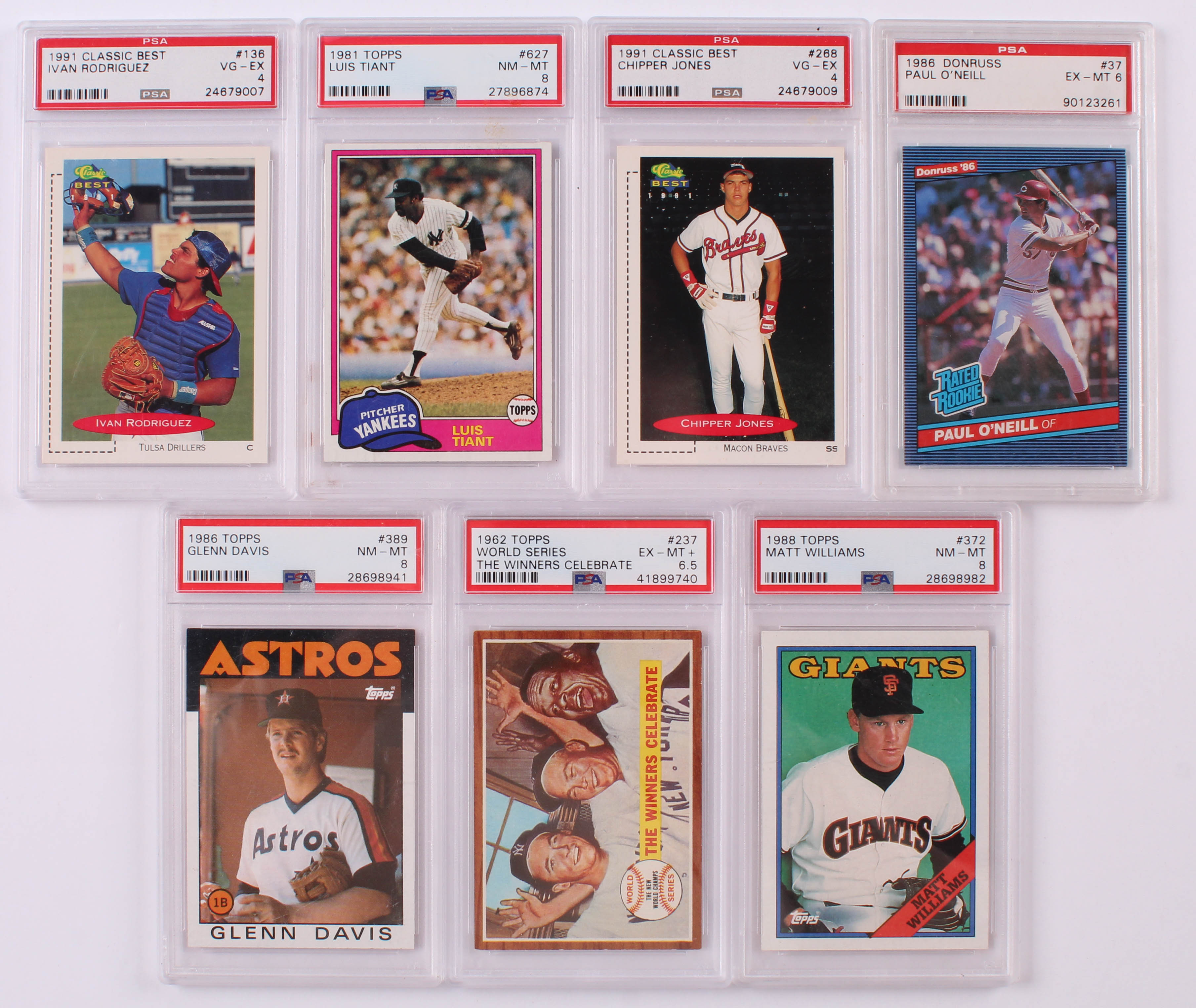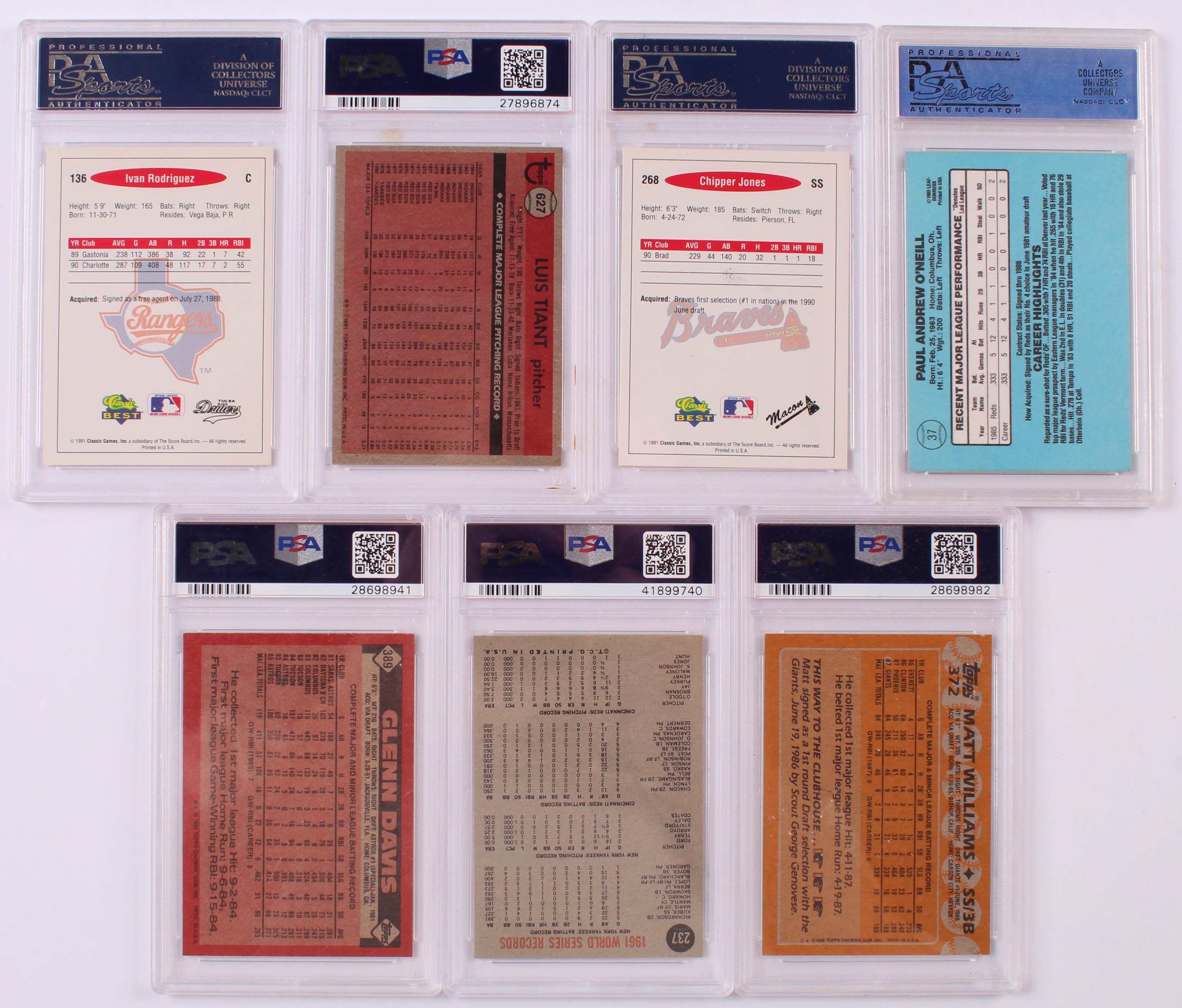 Lot of (7) PSA Graded Vintage Baseball Cards with 1991 Classic / Best #136 Ivan Rodriguez (PSA 4), 1981 Topps #627 Luis Tiant (PSA 8), 1991 Classic / Best #268 Chipper Jones (PSA 4)