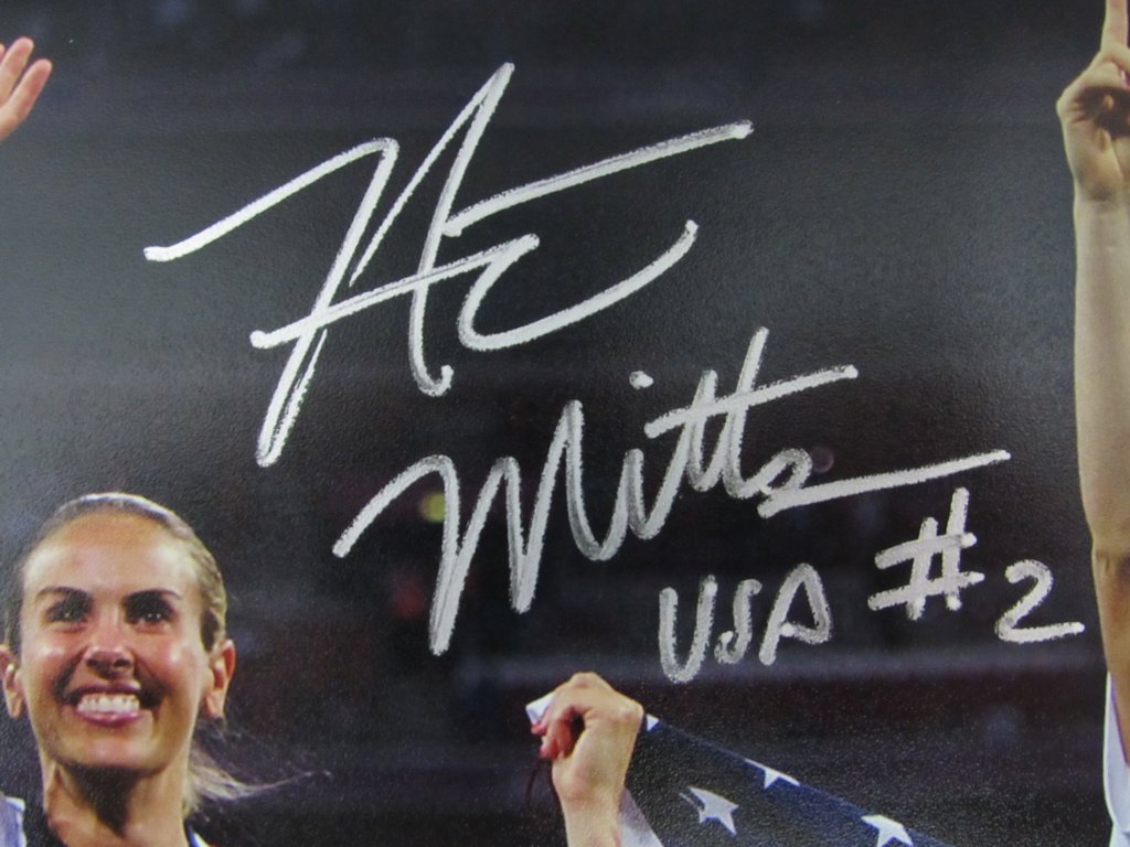 Photo measures 8" x 10" in size and has been hand-signed in silver paint pen by Heather Mitts.