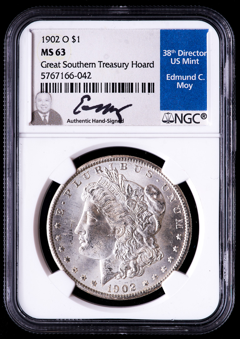1902-O Morgan Silver Dollar - Great Southern Treasury Hoard (NGC MS63) (Moy Signed Label)