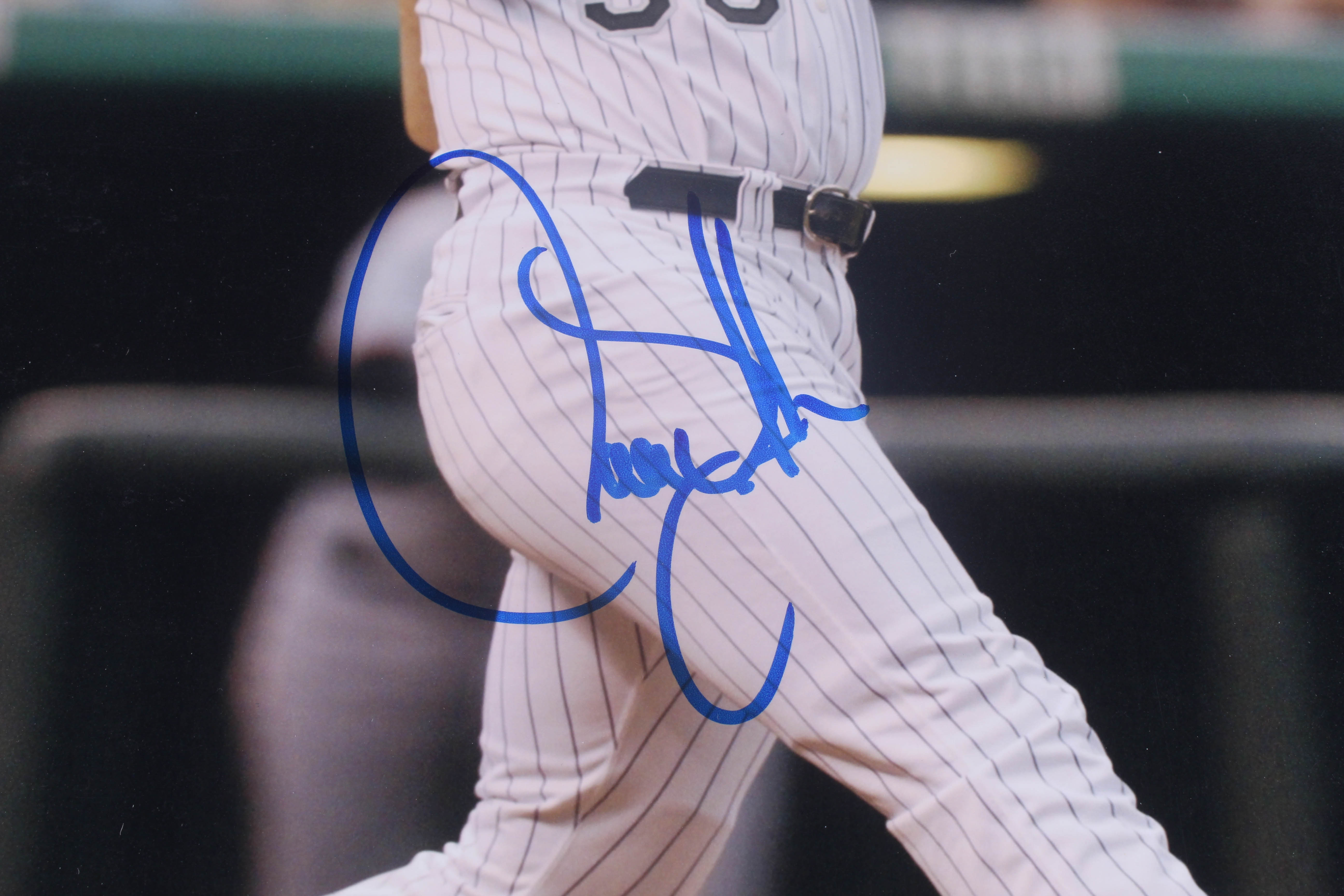 Photo measures 11" x 14" in size and has been hand-signed in blue felt-tip pen by Larry Walker (Colorado Rockies, HOF).