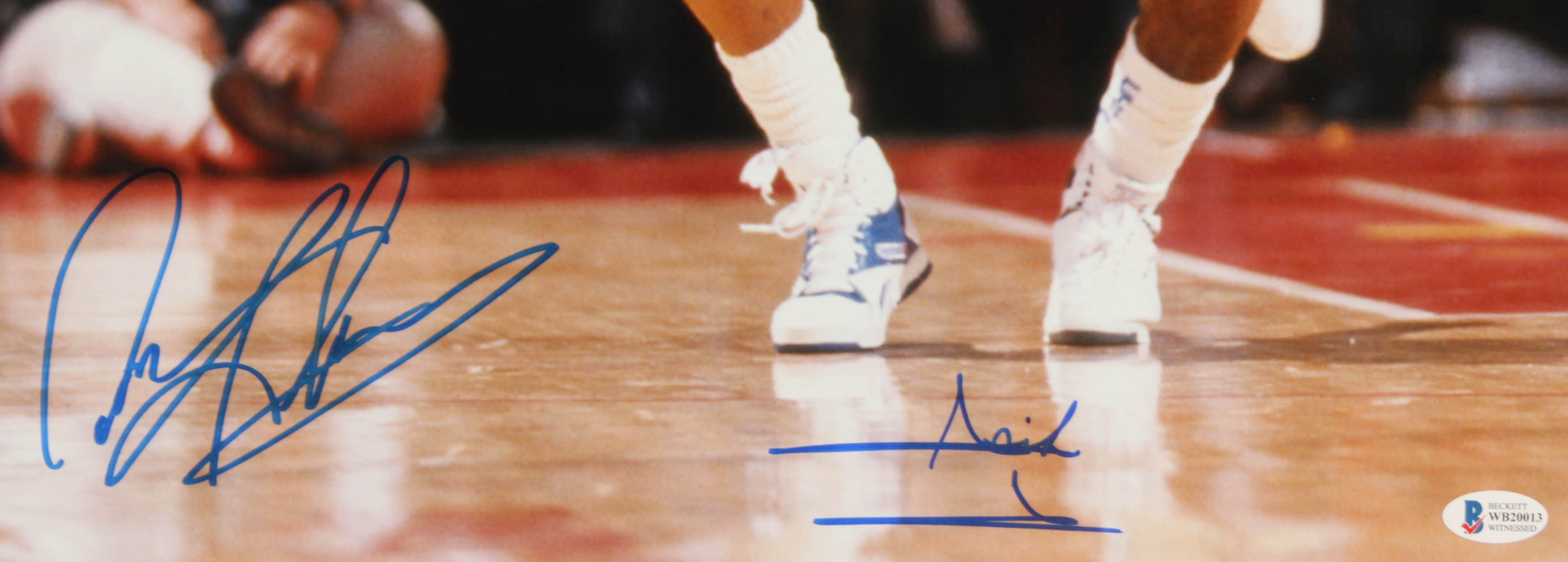 Photo measures 16" x 20" in size and has been hand-signed in blue felt-tip pen by Isiah Thomas (HOF) & Dennis Rodman (HOF).