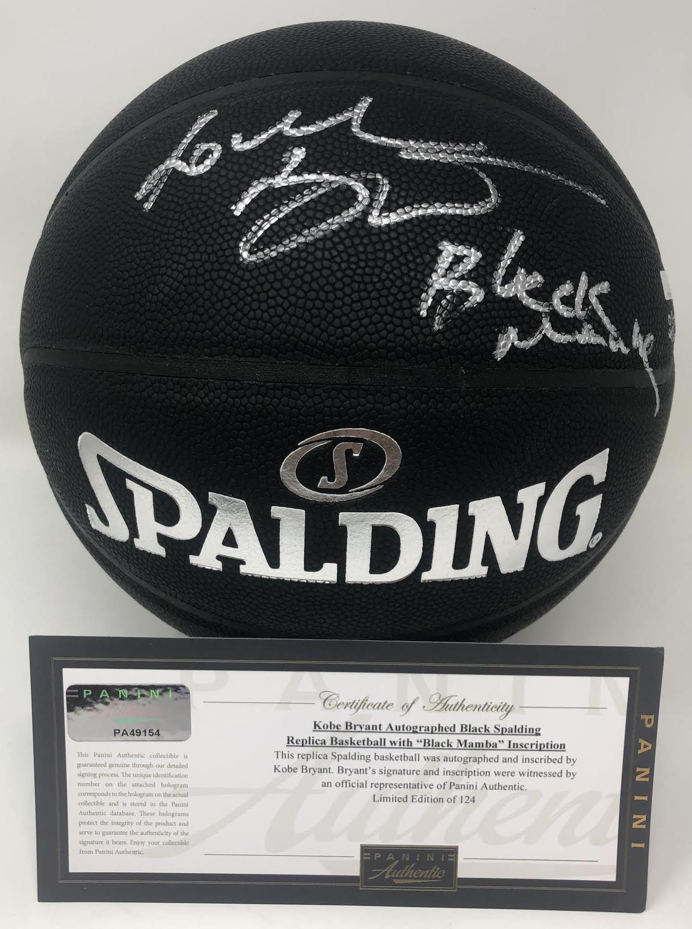 This is an Arena Series black basketball hand signed by Kobe Bryant. Kobe also added the rare inscription "Black Mamba" to this sold out basketball. This basketball includes a Panini Authentic certificate of authenticity with a unique hologram number that corresponds to the hologram on the actual collectible. These holograms protect the integrity of the product and serve to guarantee the authenticity of the signature it bears.
