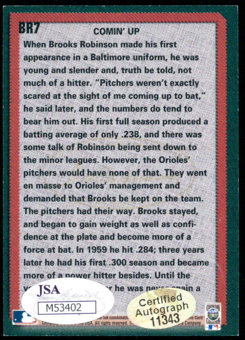 Baseball card has been hand-signed in blue felt-tip pen by Brooks Robinson (Orioles, HOF). The autograph includes an official James Spence Authentication (JSA) hologram and matching COA for authenticity purposes.