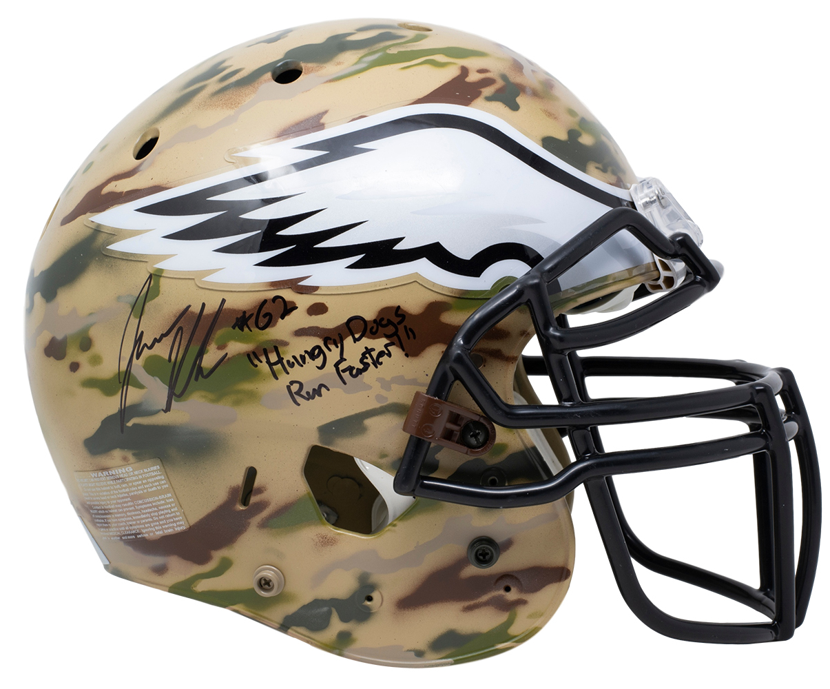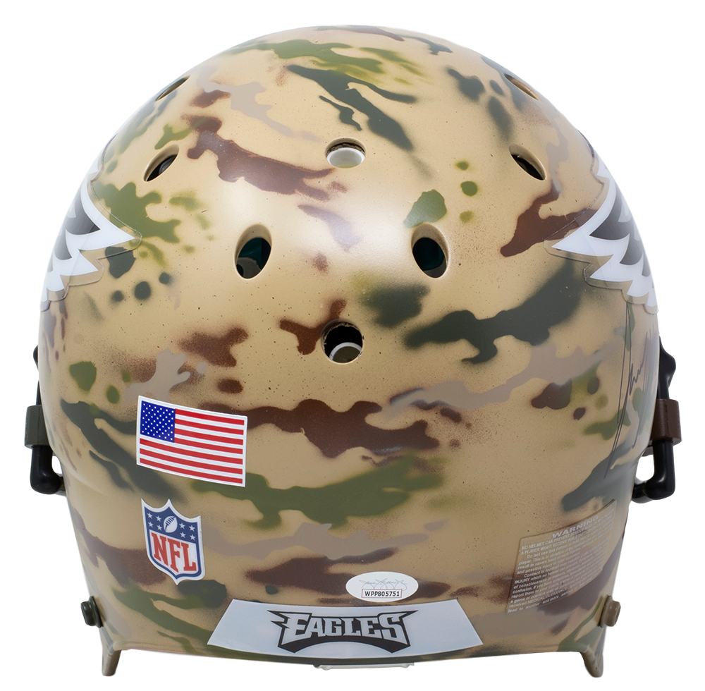 Philadelphia Eagles full-size authentic on-field camo helmet. Hand-signed in black felt-tip pen by Jason Kelce.