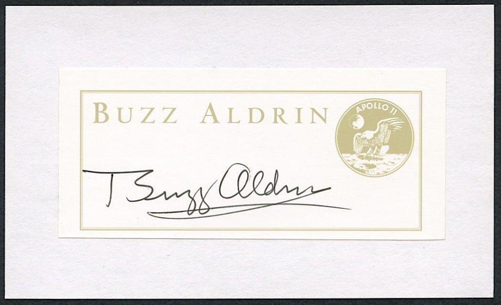 This 3" x 5" cut has been hand-signed in black ink pen by Buzz Aldrin.