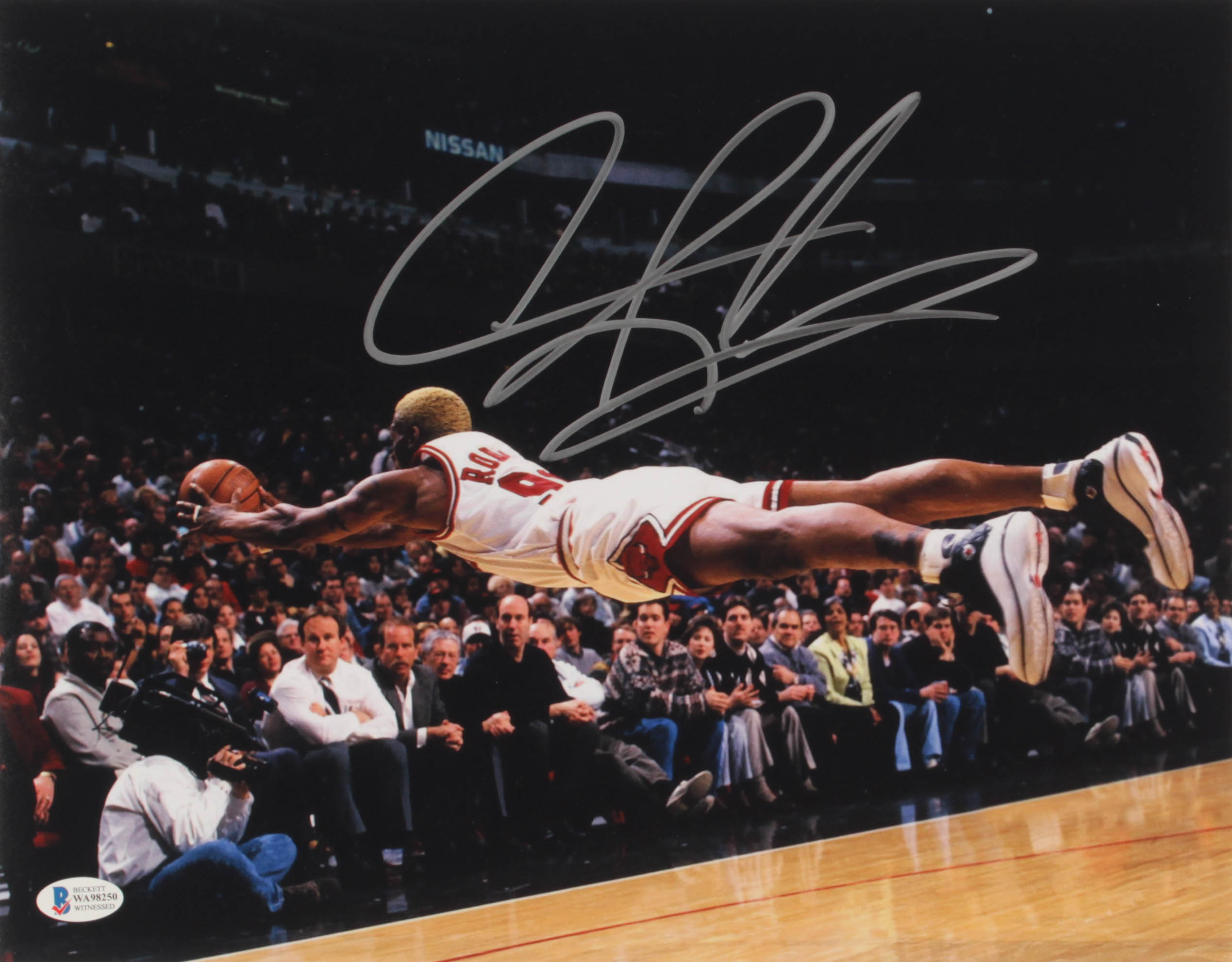 Photo measures 11" x 14" in size and has been hand-signed by Dennis Rodman (Chicago Bulls, HOF).