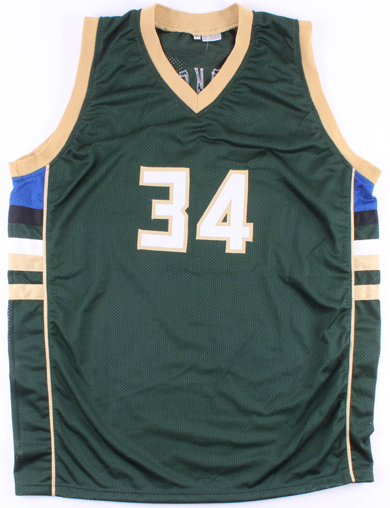 Custom on-court style jersey. Everything is sewn on, size XL. Hand-signed in black felt-tip pen by Giannis Antetokounmpo.