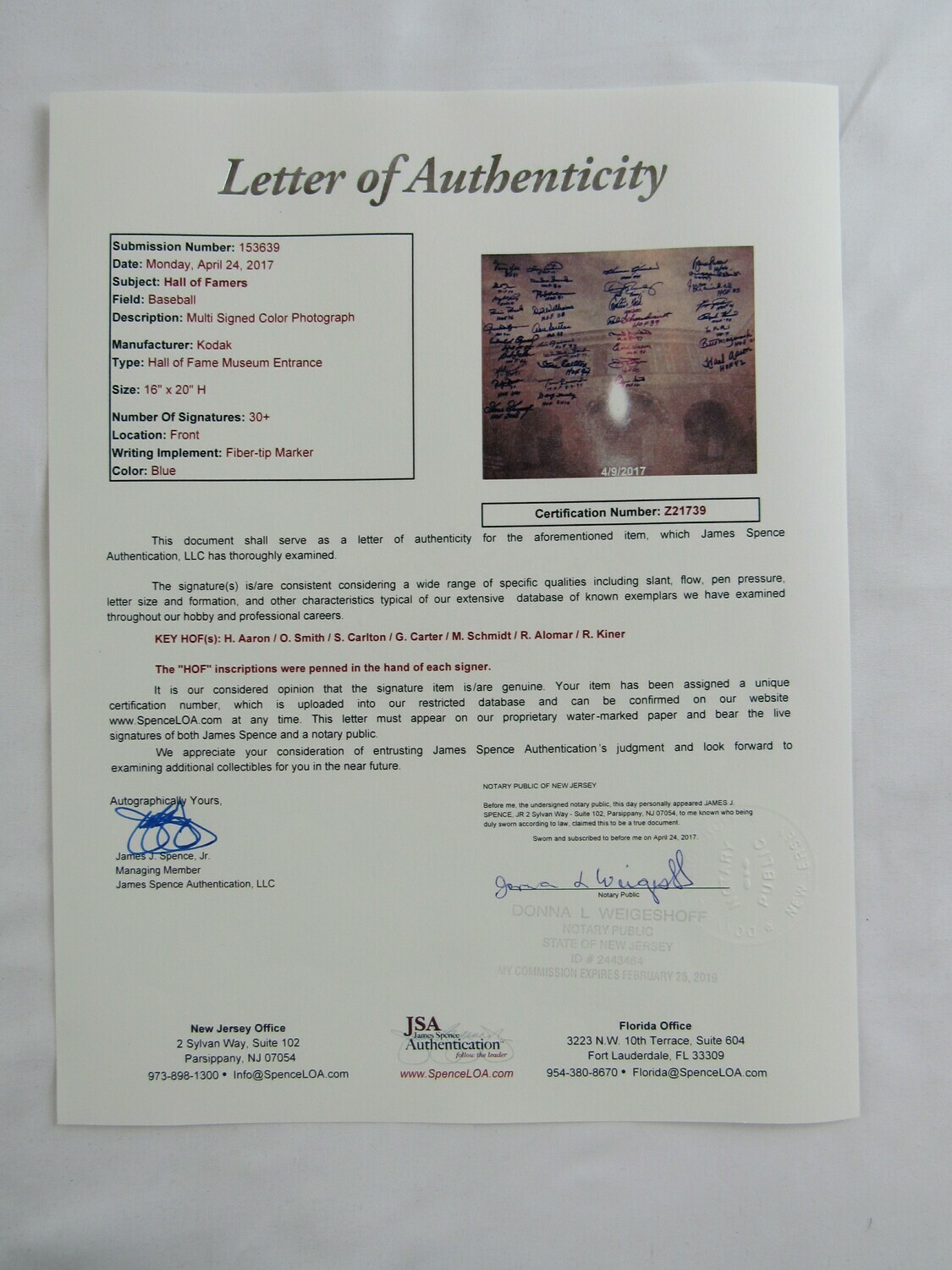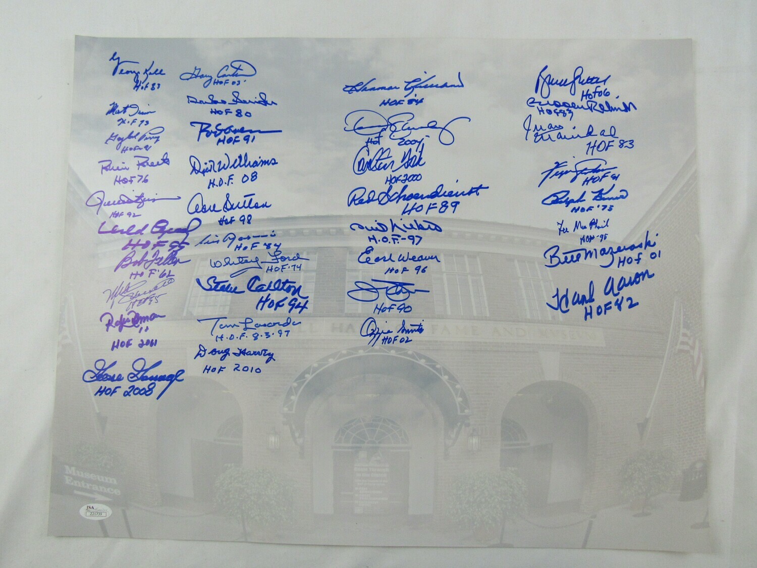 Photo measures 16" x 20" in size that has been hand-signed in blue felt-tip pen by (36) HOF baseball players including George Kell, Monte Irvin, Gaylord Perry, Robin Roberts, Rollie Fingers, Orlando Cepeda, Bob Feller, Mike Schmidt, Roberto Alomar, Goose Gossage, Gary Carter, Duke Snider, Rod Carew, Dick Williams, Don Sutton, Luis Aparicio, Whitey Ford, Steve Carlton, Tom Lasorda, Doug Harvey, Harmon Killebrew, Dennis Eckersley, Carlton Fisk, Red Schoendienst, Phil Niekro, Earl Weaver, Jim Palmer, Ozzie Smith, Bruce Sutter, Brooks Robinson, Juan Marichal, Fergie Jenkins, Ralph Kiner, Lee MacPhail, Bill Mazeroski, and Hank Aaron. Please note, each player added their respective year of induction as an inscription.