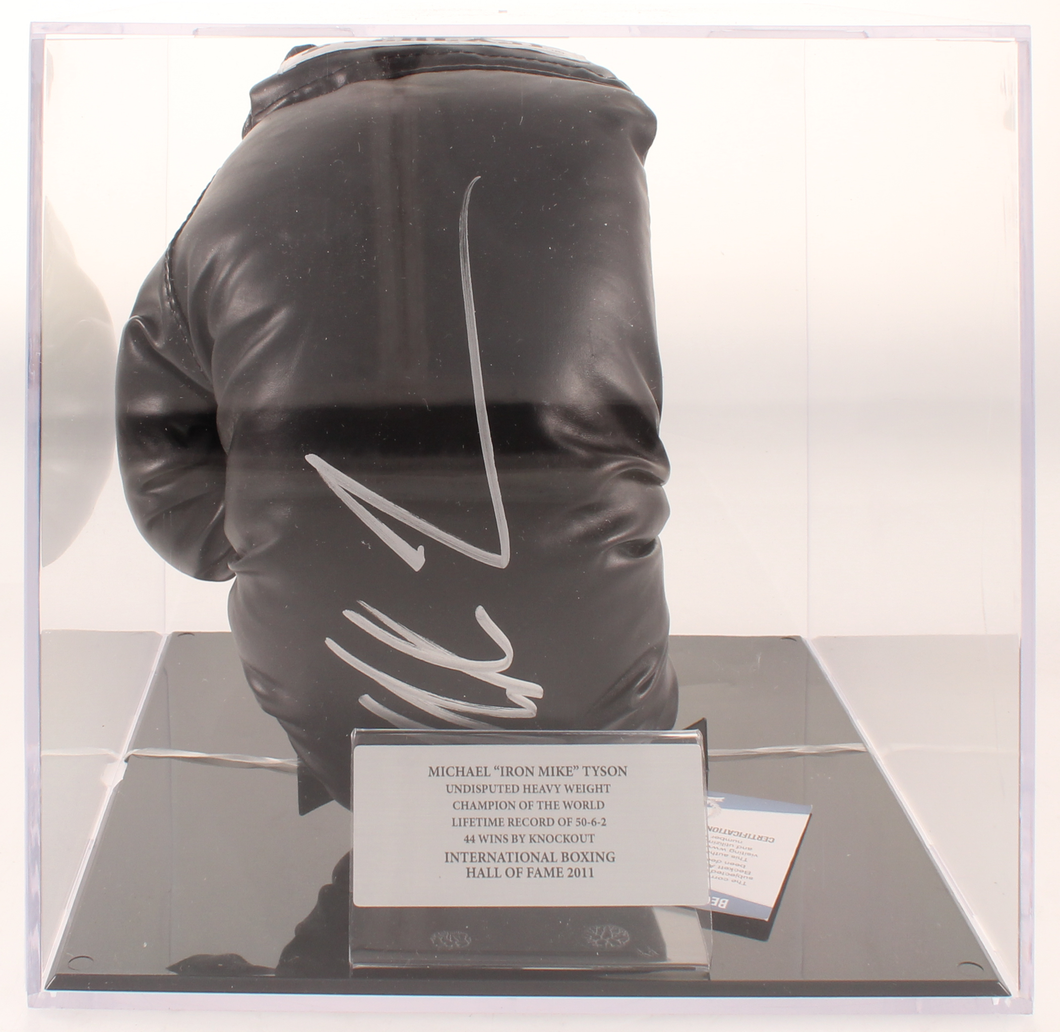 Everlast boxing glove. Hand-signed in silver paint pen by Mike Tyson (HOF). Includes display case as shown.