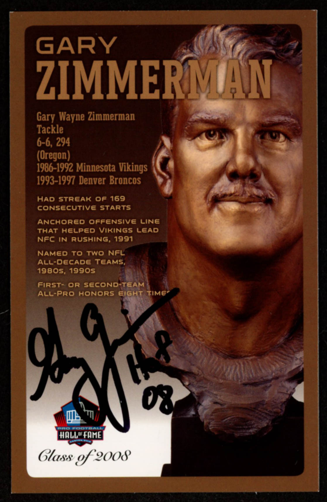 Gary Zimmerman Signed LE Bronze Bust Football Hall of Fame Postcard Inscribed "HOF 08" (Pro Football Hall of Fame COA)