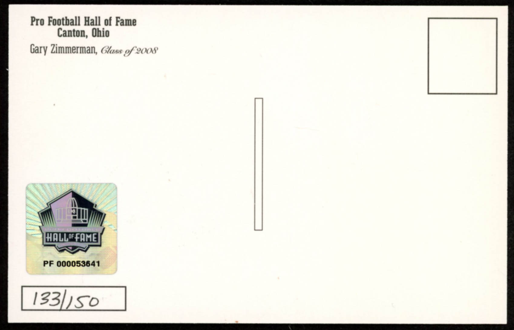 Bronze Bust Pro Football Hall of Fame postcard measures 3.5" x 5.5" and has been hand-signed in black felt-tip pen by Gary Zimmerman (Minnesota Vikings, HOF). The postcard is limited edition and has been hand-numbered #133/150.